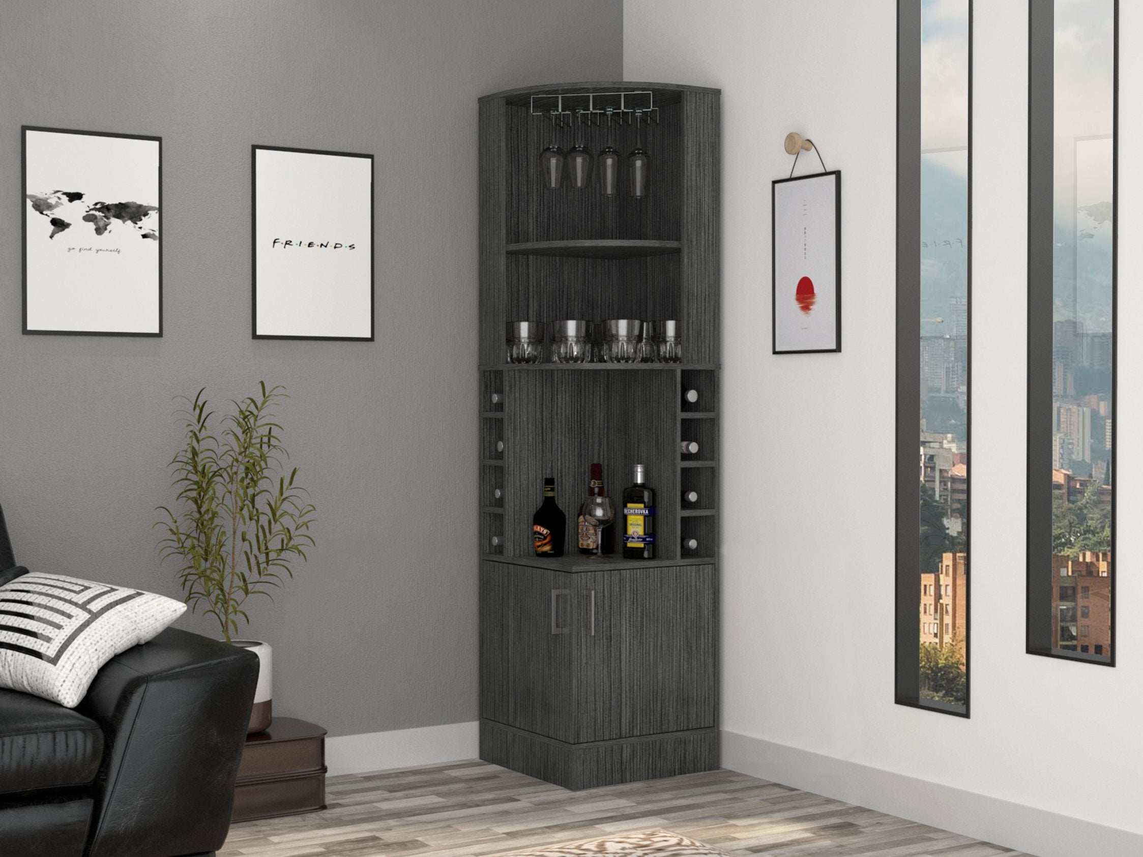 Create an inviting home bar nook with the Syrah Corner Bar Cabinet — a space-saving, stylish solution for organizing bottles, glassware, and bar essentials. Its compact corner design maximizes floor space while bringing a warm dark brown finish and practical storage within easy reach.