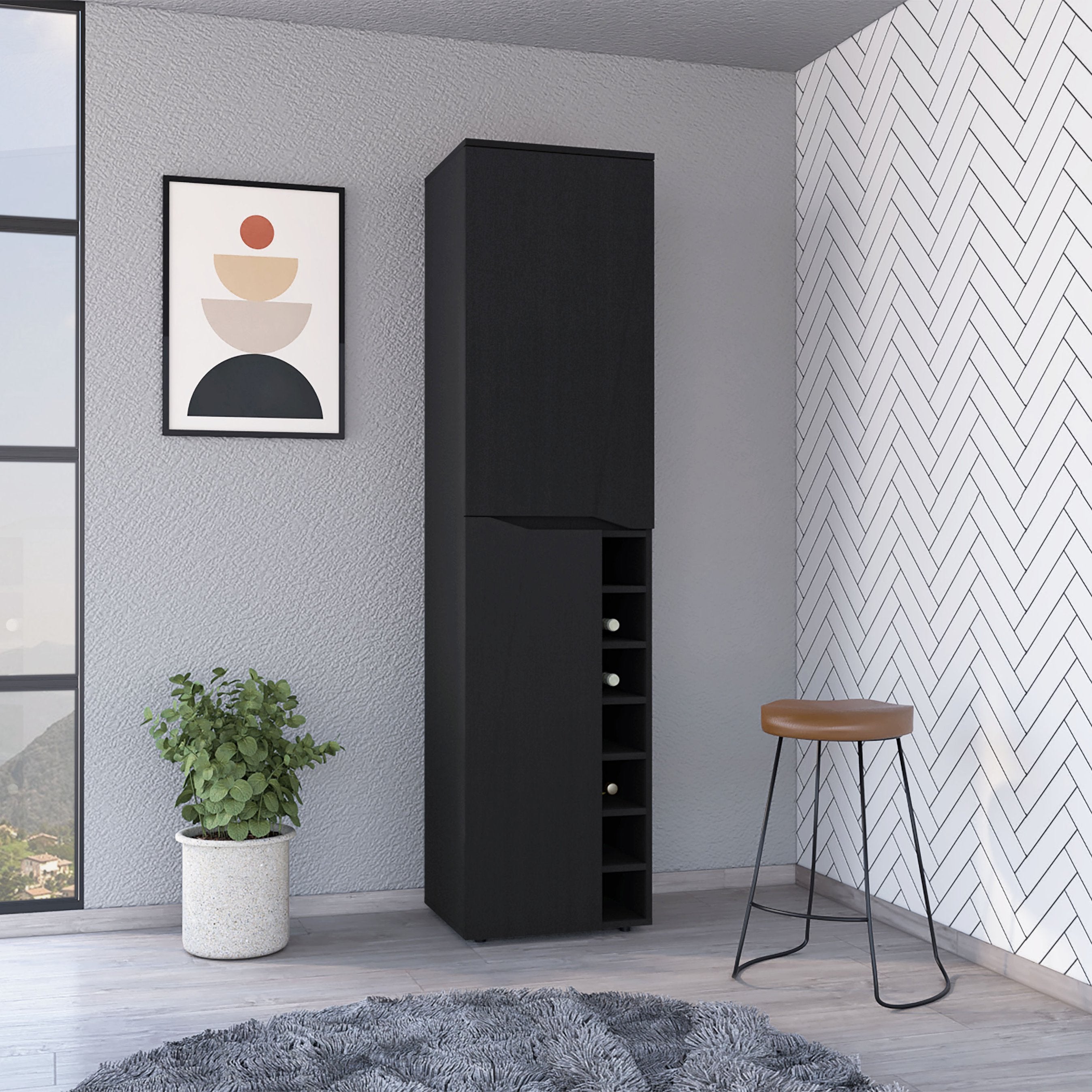 This sleek, black tall cabinet combines stylish living-room appeal with practical storage tailored for entertaining and everyday use. Designed from durable particle board, it offers organized spaces for wine bottles, glassware, and supplies while maintaining a compact footprint that fits modern interiors.