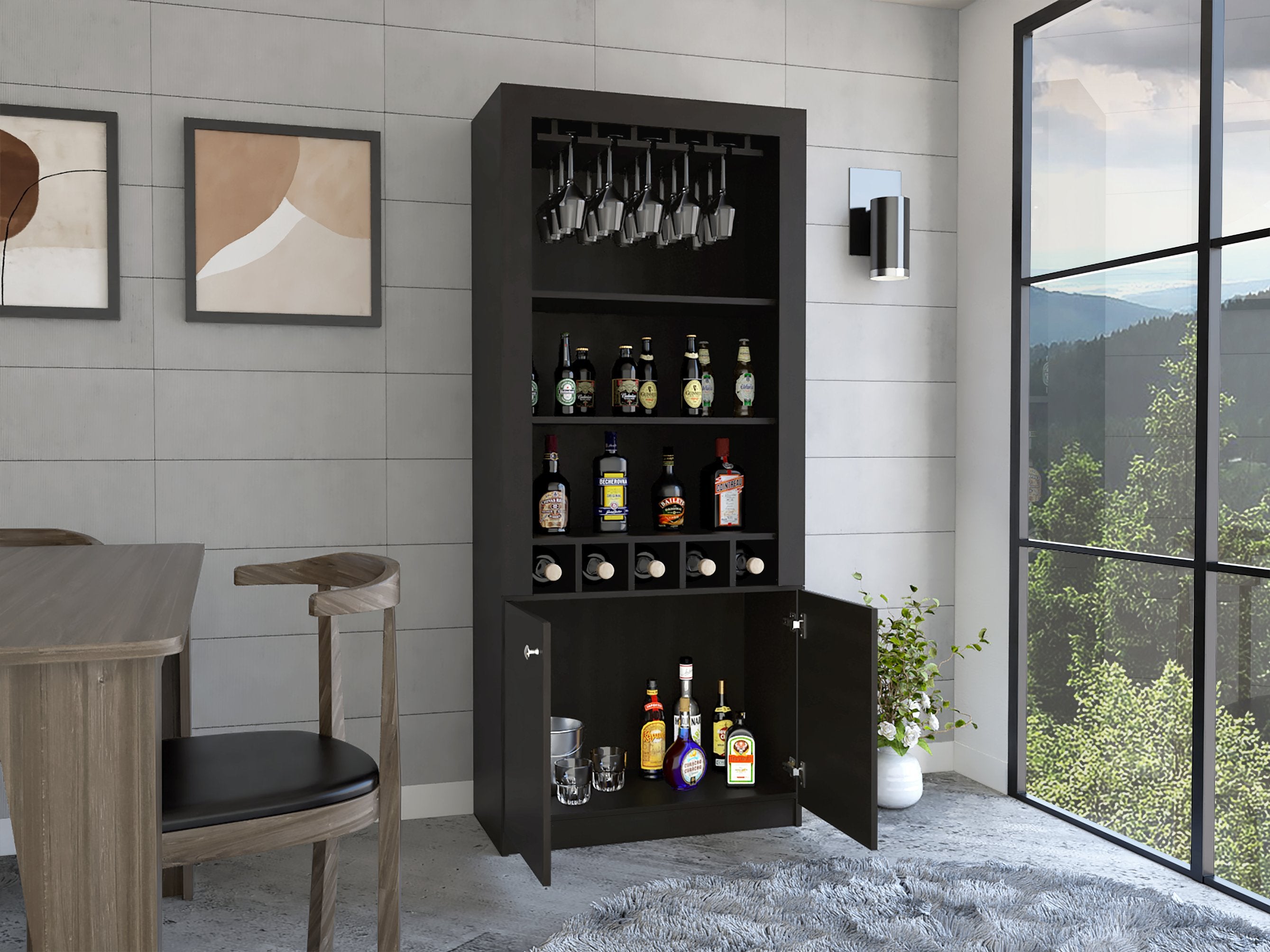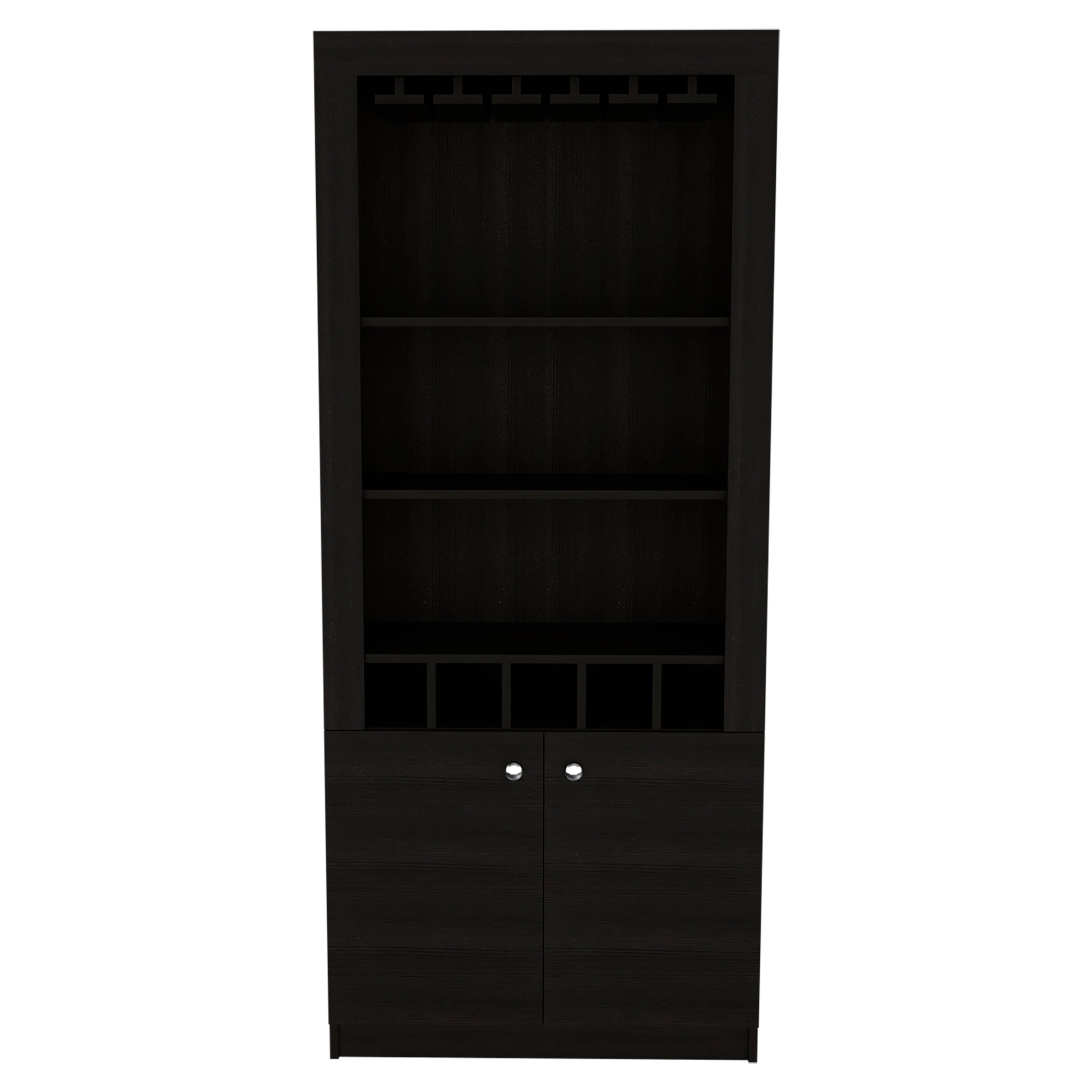 Elevate your entertaining space with a sleek, modern bar cabinet crafted to organize glassware, bottles, and accessories while adding a rich Wenge finish to your room. Thoughtfully configured for both display and concealed storage, this compact piece balances practical shelving, a stemware rack, and dedicated bottle cubbies so everything you need for serving is within easy reach.