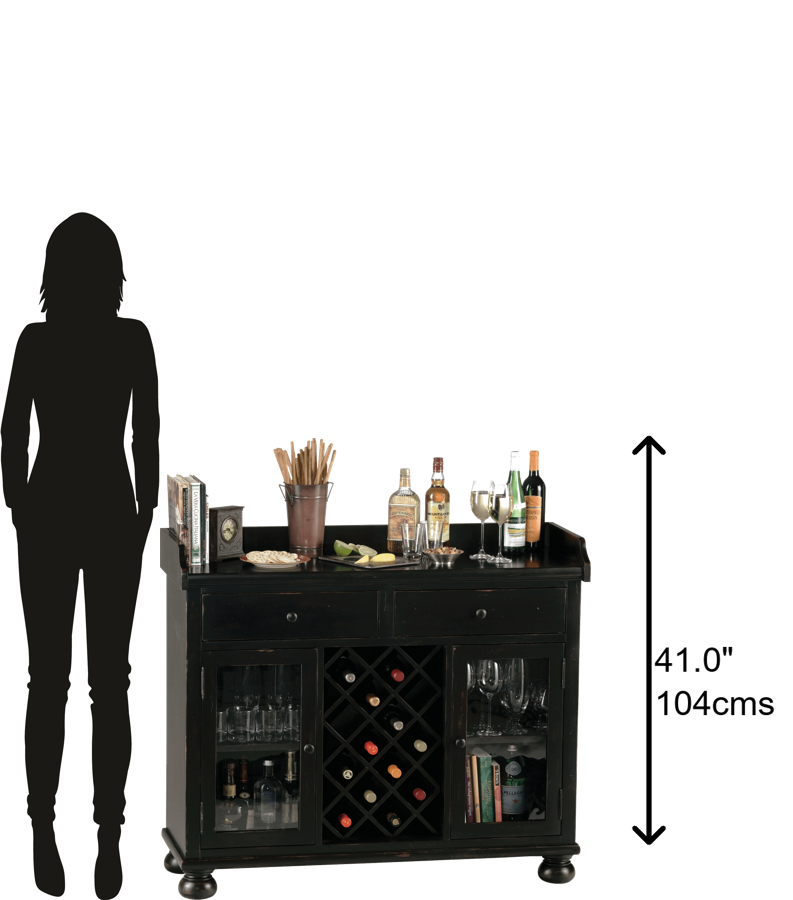- This Wine & Bar cabinet has a decorative apron that surrounds the serving area on three sides, and bun feet create a pleasing accent on the base.