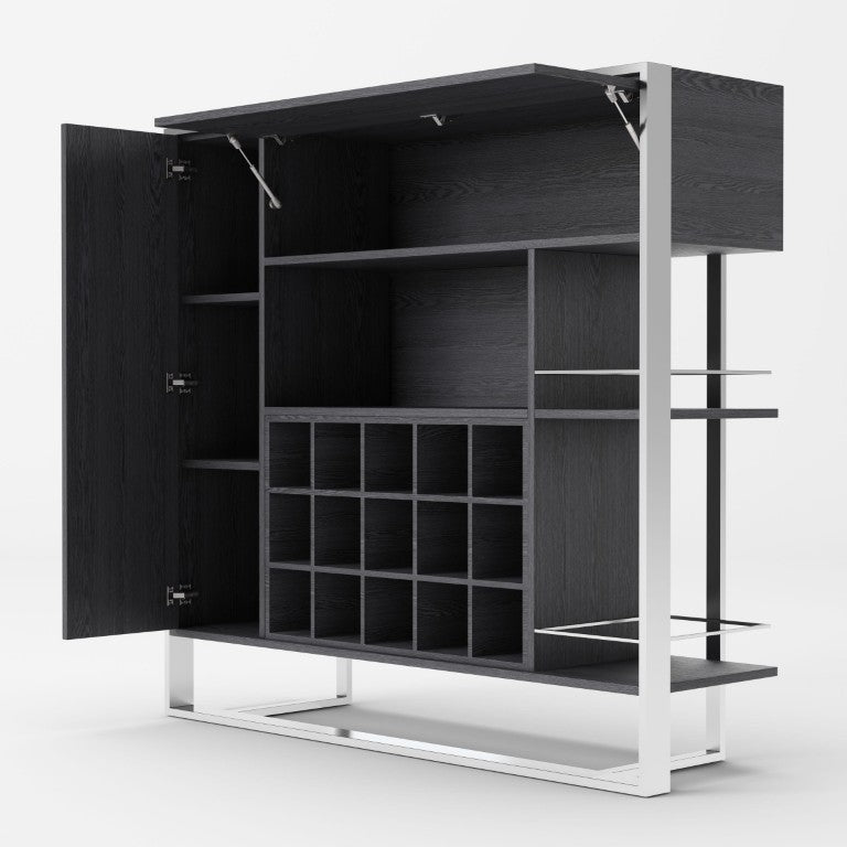 Elevate your entertaining space with the Fauna wine cabinet, where contemporary design meets practical storage. Its elm grey veneer and polished stainless-steel frame create a sleek focal point that complements both modern and transitional interiors. Designed to showcase and protect your collection, this cabinet holds a variety of bottle sizes while maintaining a compact, sculptural profile.