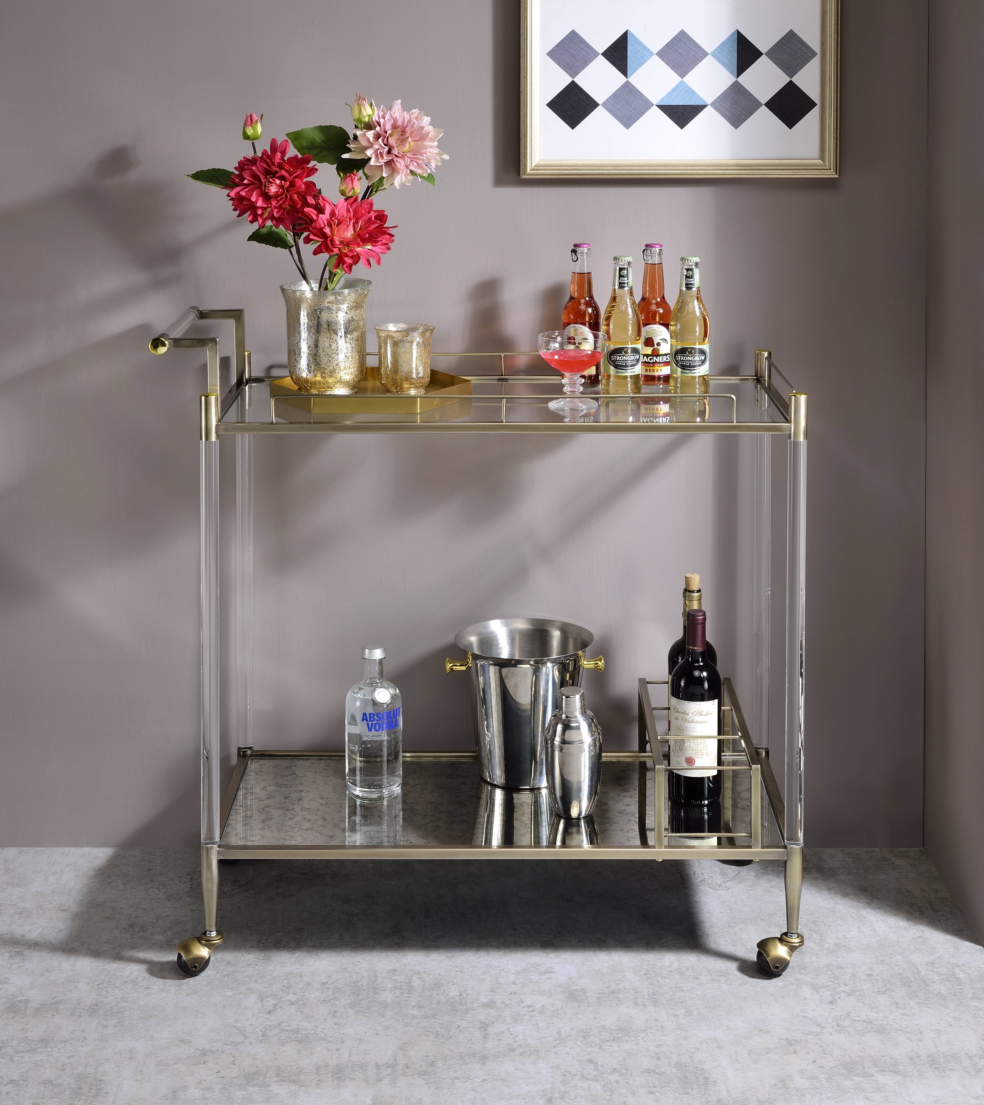 - This elegant serving cart combines vintage charm and modern sophistication with its antique mirror and wire brass accents.