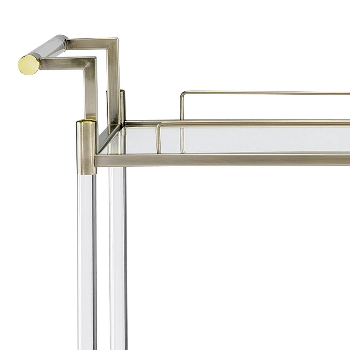 Elevate your entertaining and home decor with this refined serving cart that blends antique-inspired finishes with contemporary functionality. Featuring an antique mirror surface, wire brass accents, and clear tempered glass shelves, it offers a sophisticated platform for serving drinks, displaying barware, or showcasing decorative pieces—while remaining mobile and practical for everyday use.