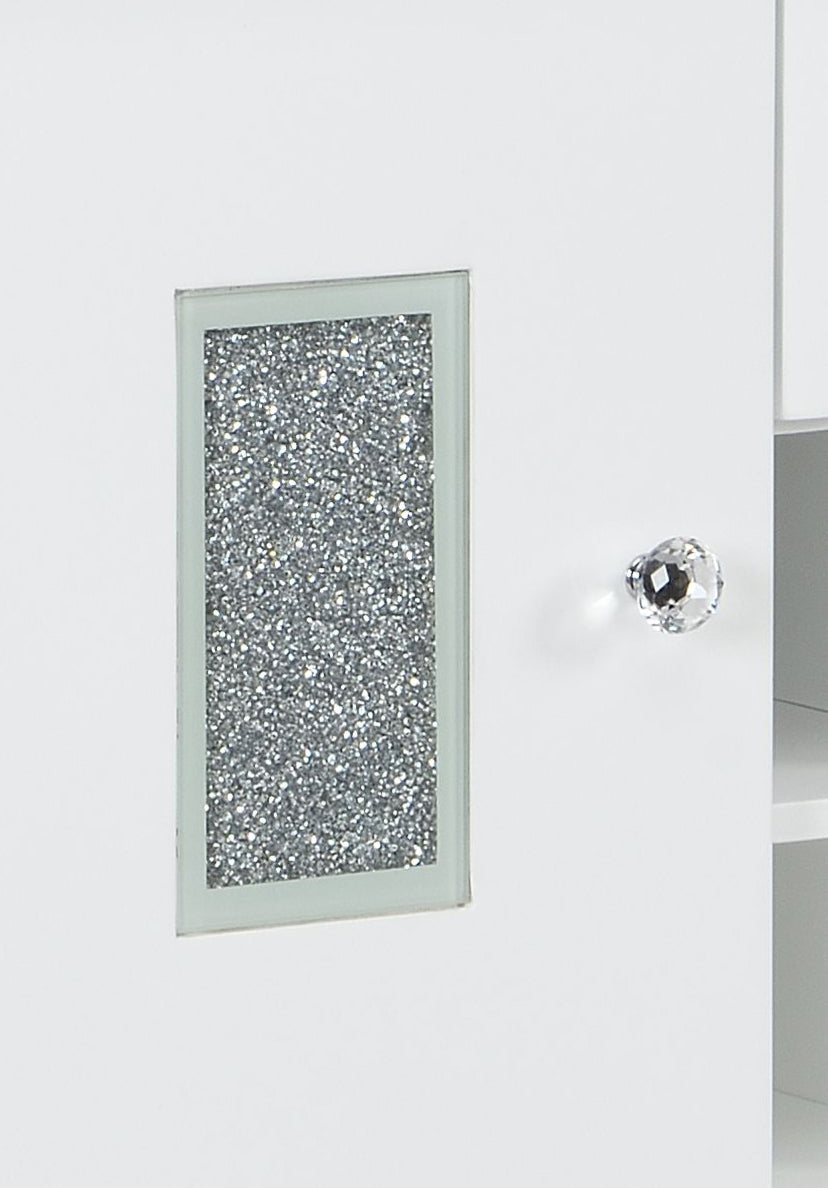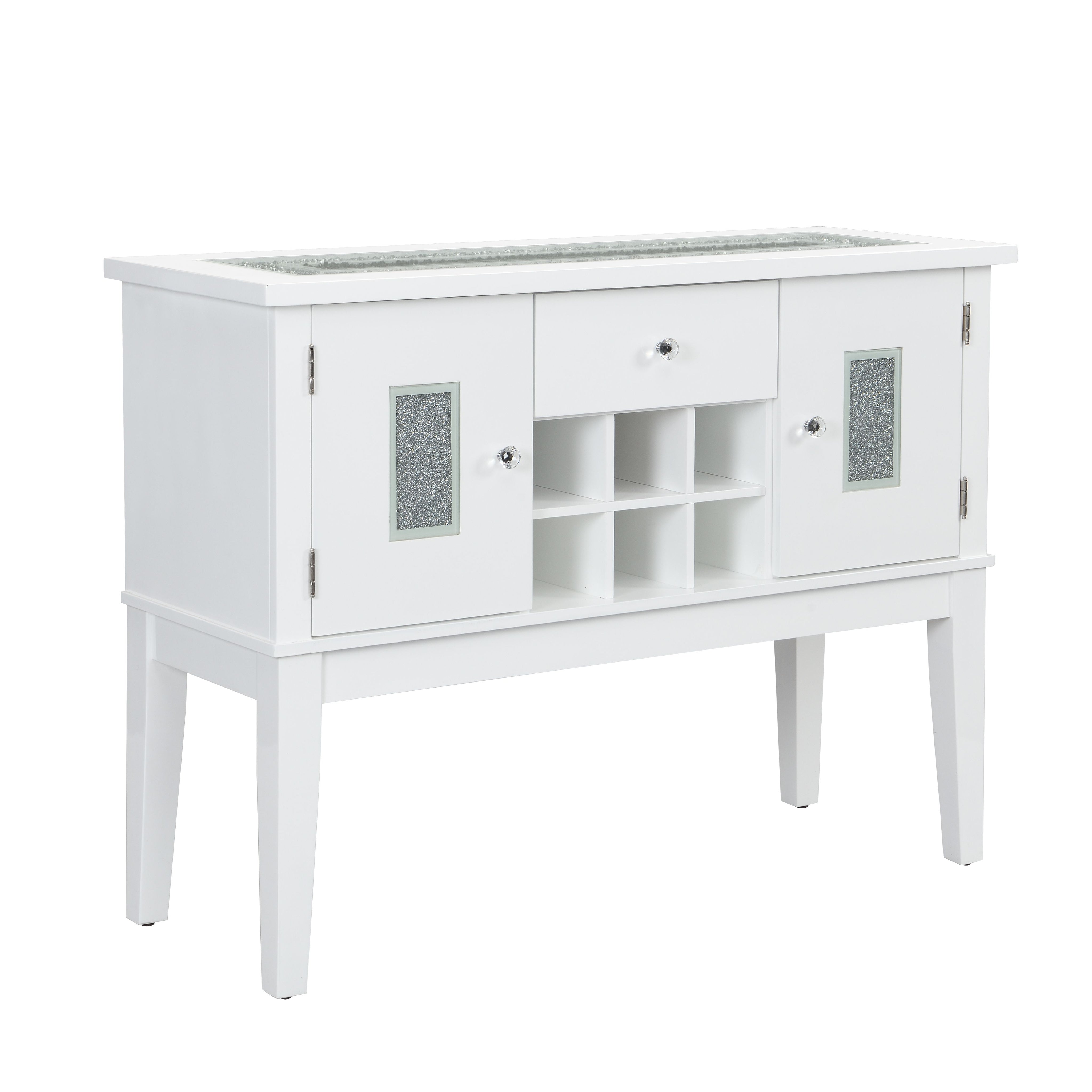 Elevate your entertaining space with the Elizaveta server — a sleek, contemporary piece that blends high-gloss elegance with functional storage. Its sparkling acrylic diamond inlay and tempered glass accents create a refined focal point, while smart interior features like a wine rack and felt-lined drawer keep your serving essentials organized and protected. Designed for durability and easy maintenance, this server suits modern dining rooms, living areas, or home bars.