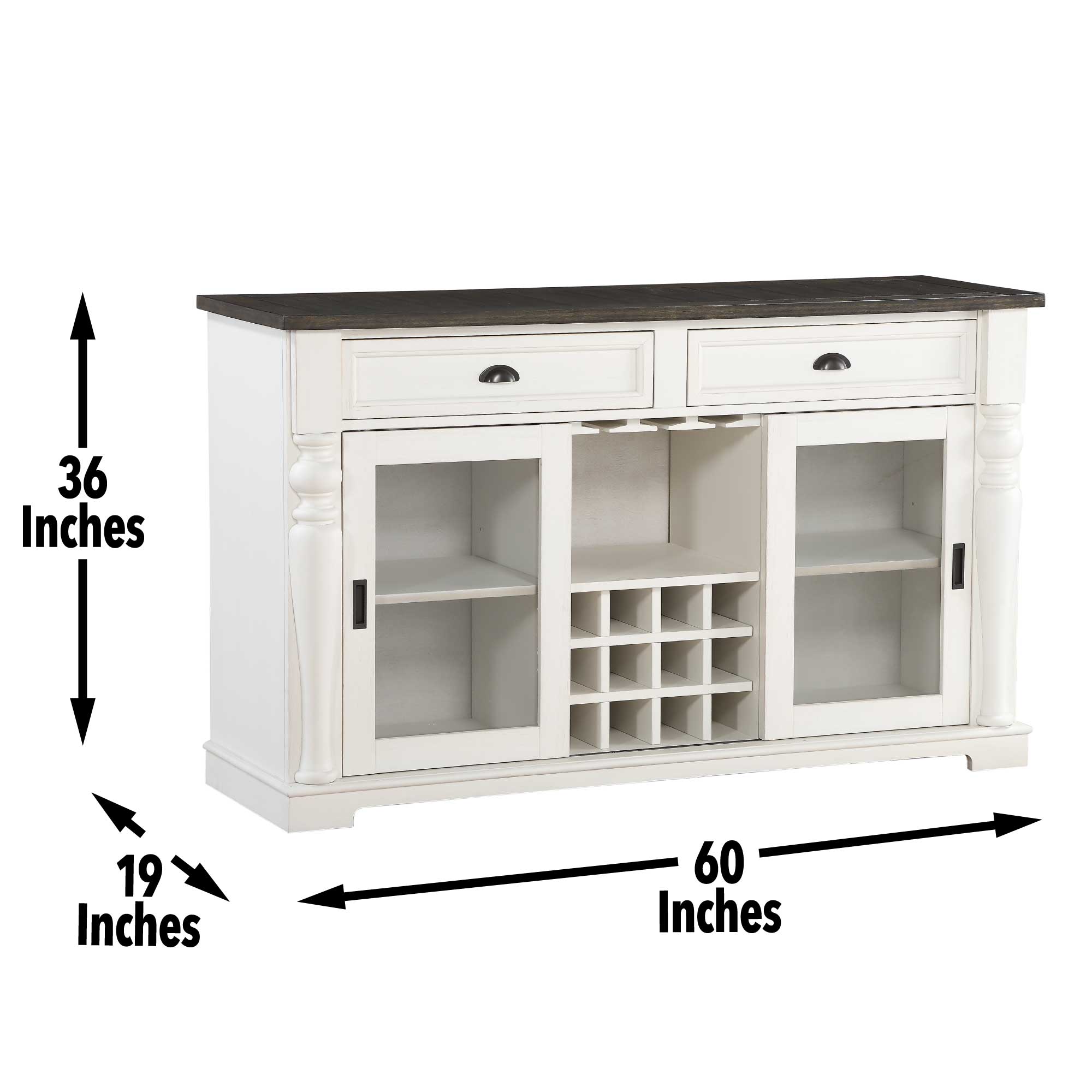 Add timeless farmhouse charm and practical storage to your dining area with this elegant two-tone server. Crafted from quality acacia veneers and hardwood solids, it combines refined details—turned pilasters, a picture-frame apron, and pewter half-cup hardware—with versatile storage options to organize glassware, bottles, and tabletop essentials while creating a stylish focal point.