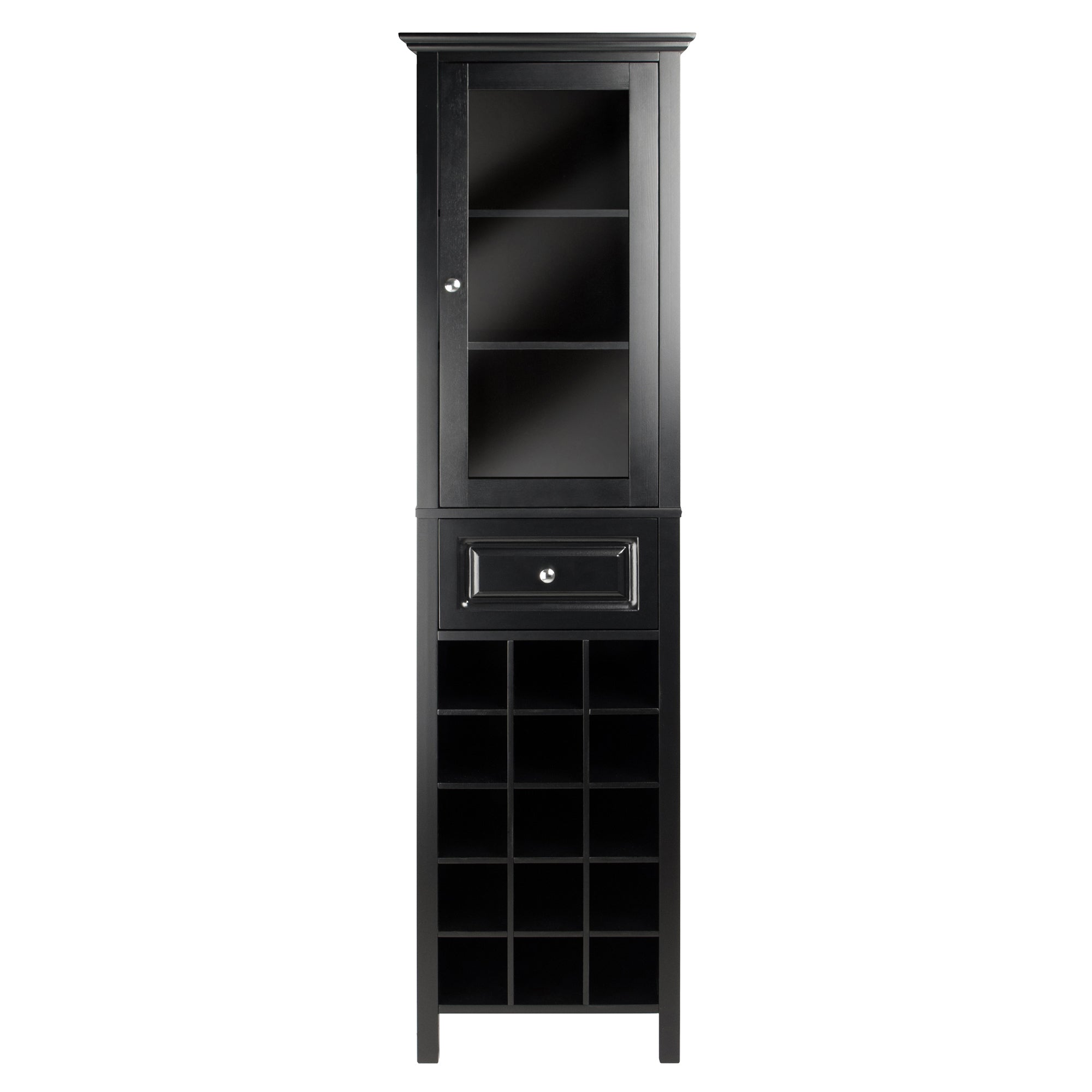 - Bottom shelf holds 15 bottles. Made of composite wood in black finish. Assembly required.