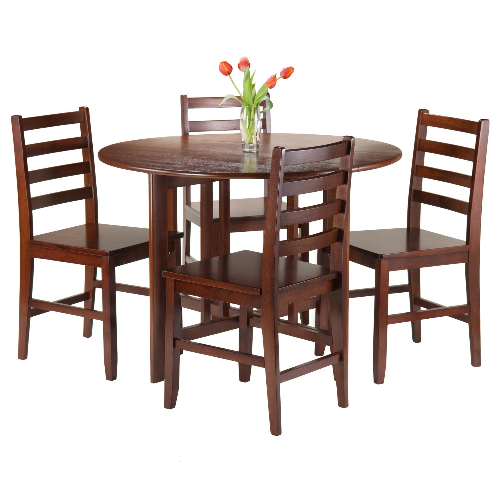 Alamo, Mission side Round Drop Leaf Table has a traditional style that is updated with modern durability. The perfect piece for kitchen or dining. With two drop-leaf extension, table is for two or four people. 5-Pc Set Table and 4 Chairs.
