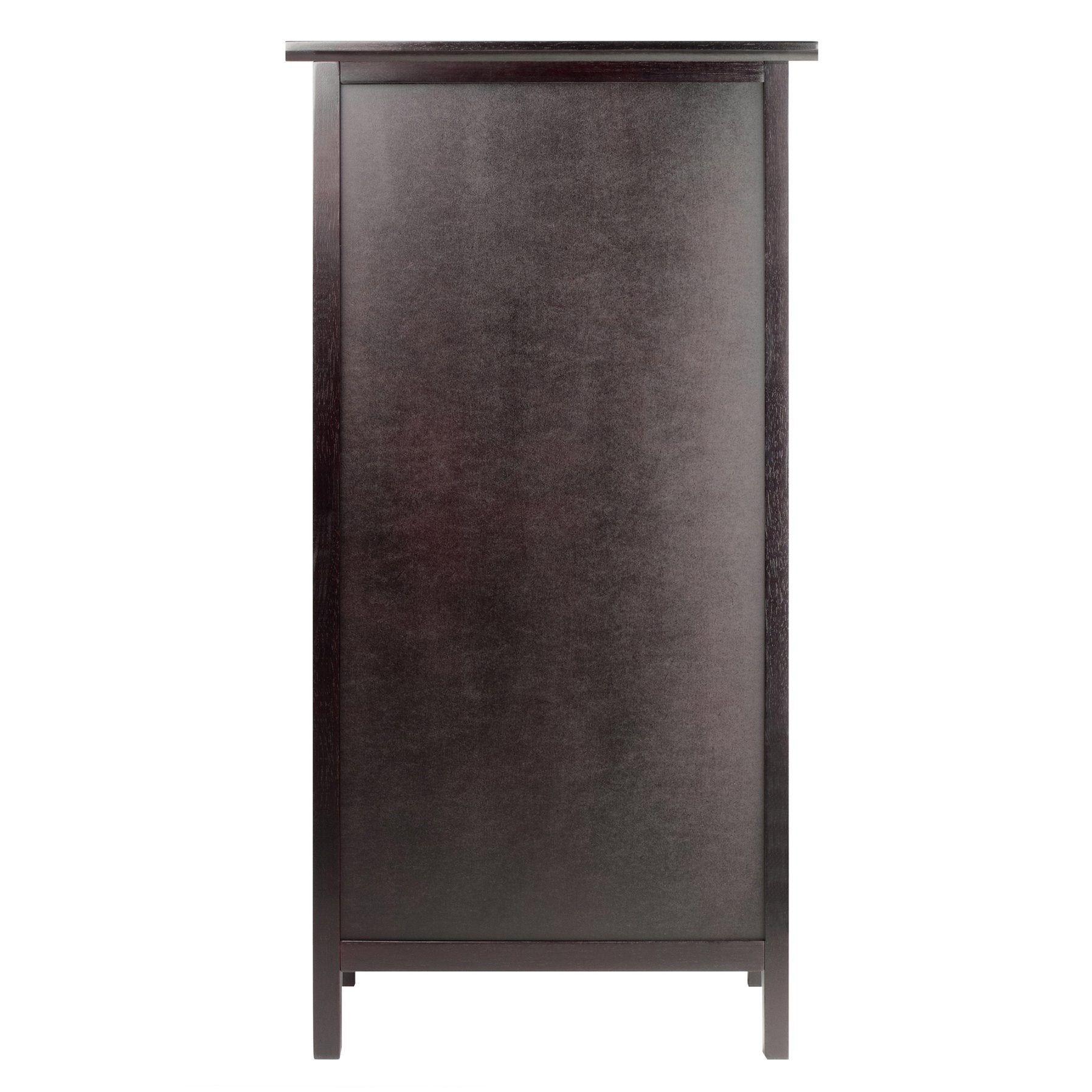 The Alta wine storage shelf brings a contemporary solution to your wine storage and entertaining needs with its clean lines, espresso finish, and simplistic design. The two top shelves can be used either for 8 wine bottles or 4 wine bottles on the top shelf and accessory storage on the bottom. The cabinet has a glass door so you can see all your wine glass storage within.