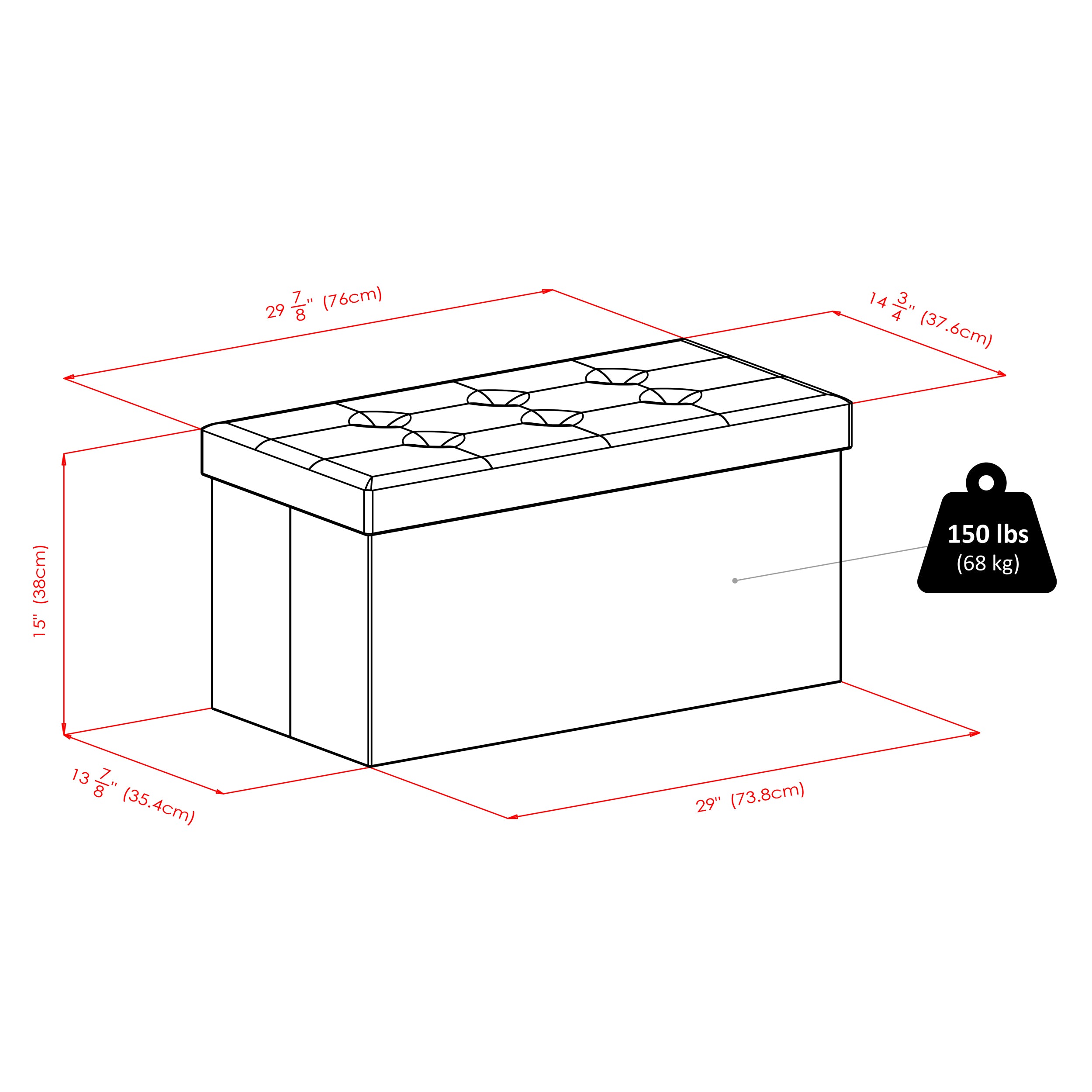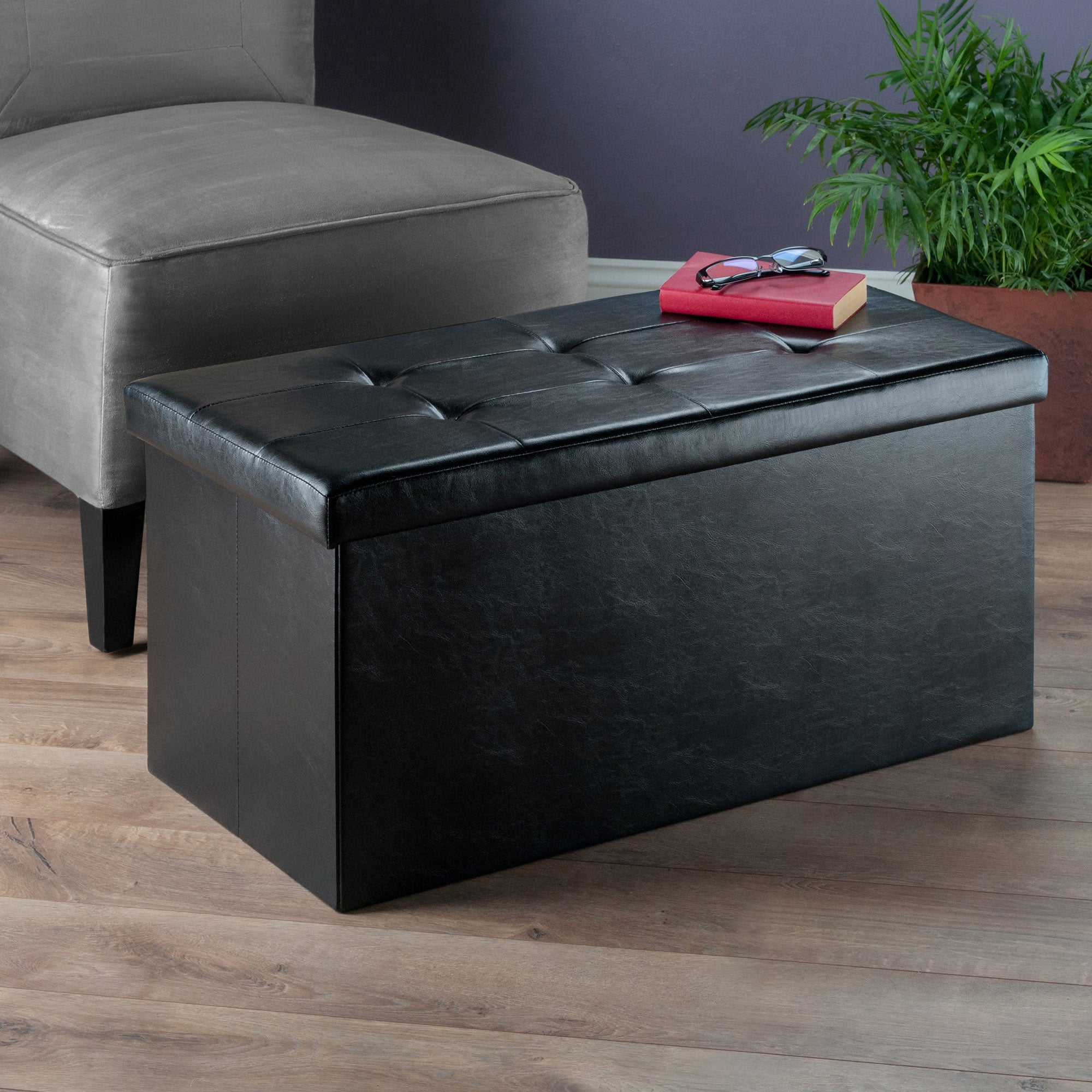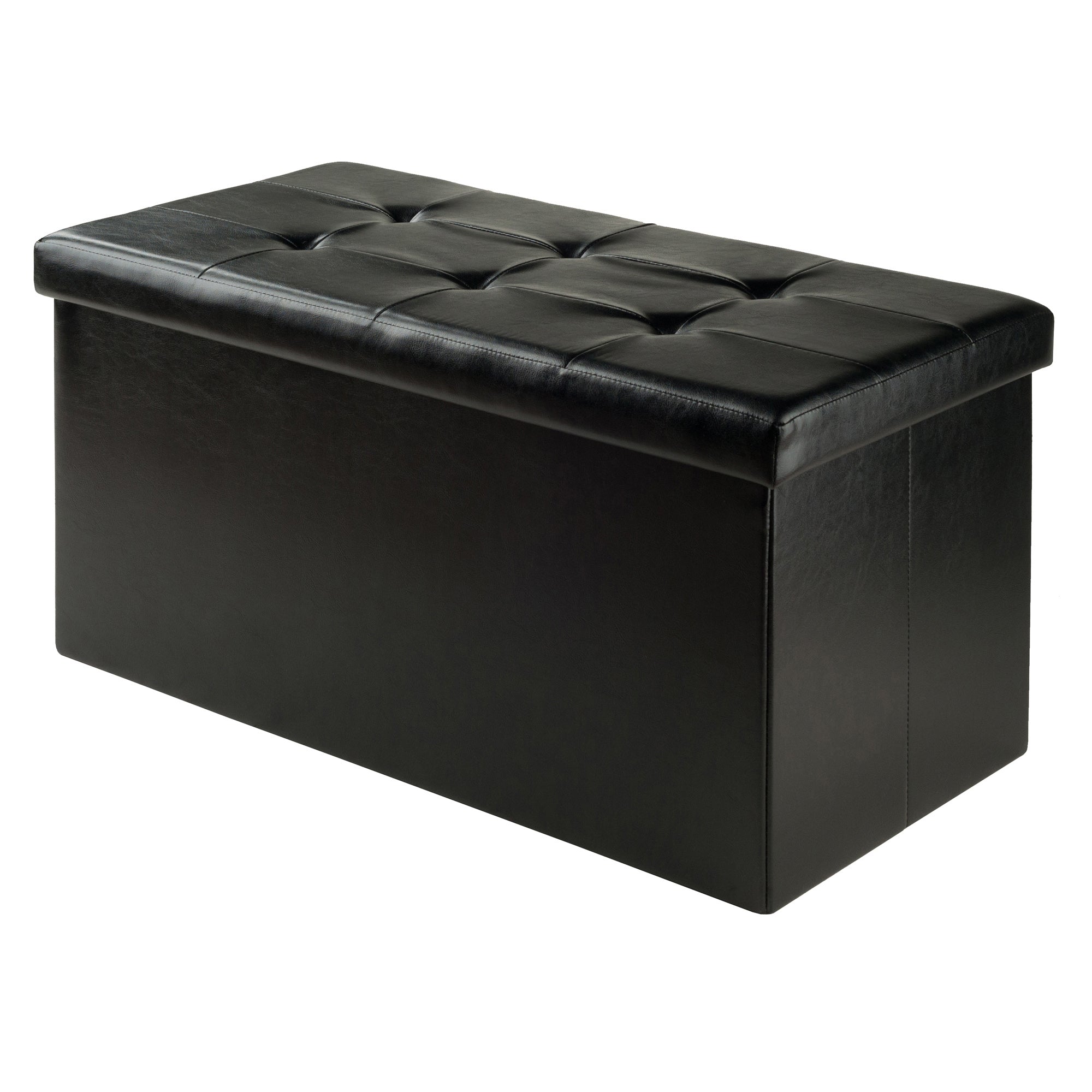 Whether you're relaxing with your feet up or using the Ashford Ottoman as extra seating, this unique piece will also provide plenty of storage. Perfect for keeping extra cushions in the living room, games and toys in the family room, or shoes and clothing in the bedroom. The cushioned faux leather seat lifts away, affording easy access to the storage space inside. The base of the ottoman easily folds so when it is not in use, the unit can be moved or compactly stored. Both base and ottoman top are made of black faux leather.