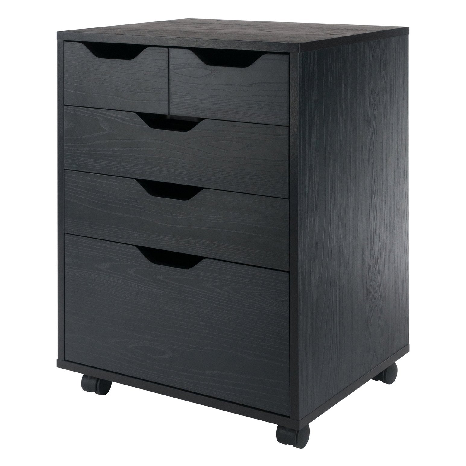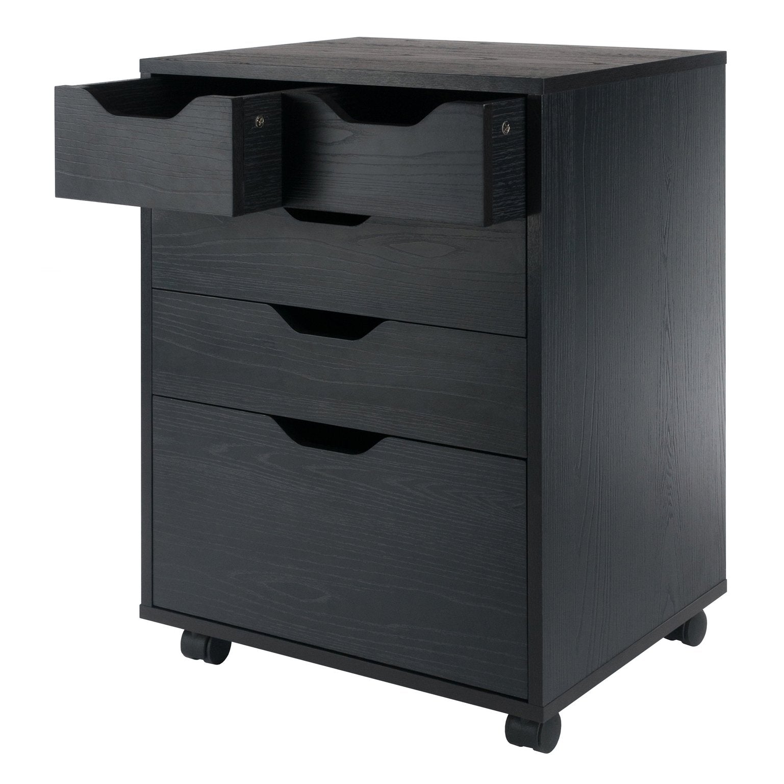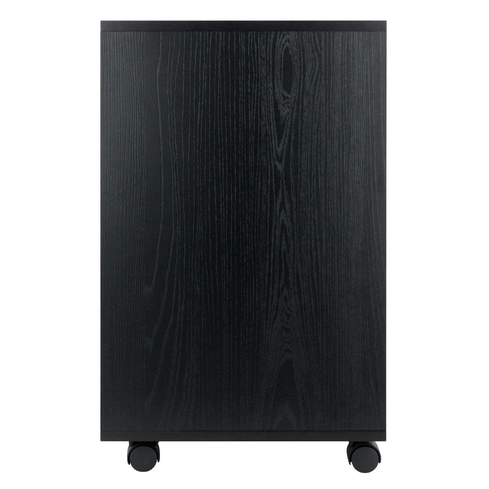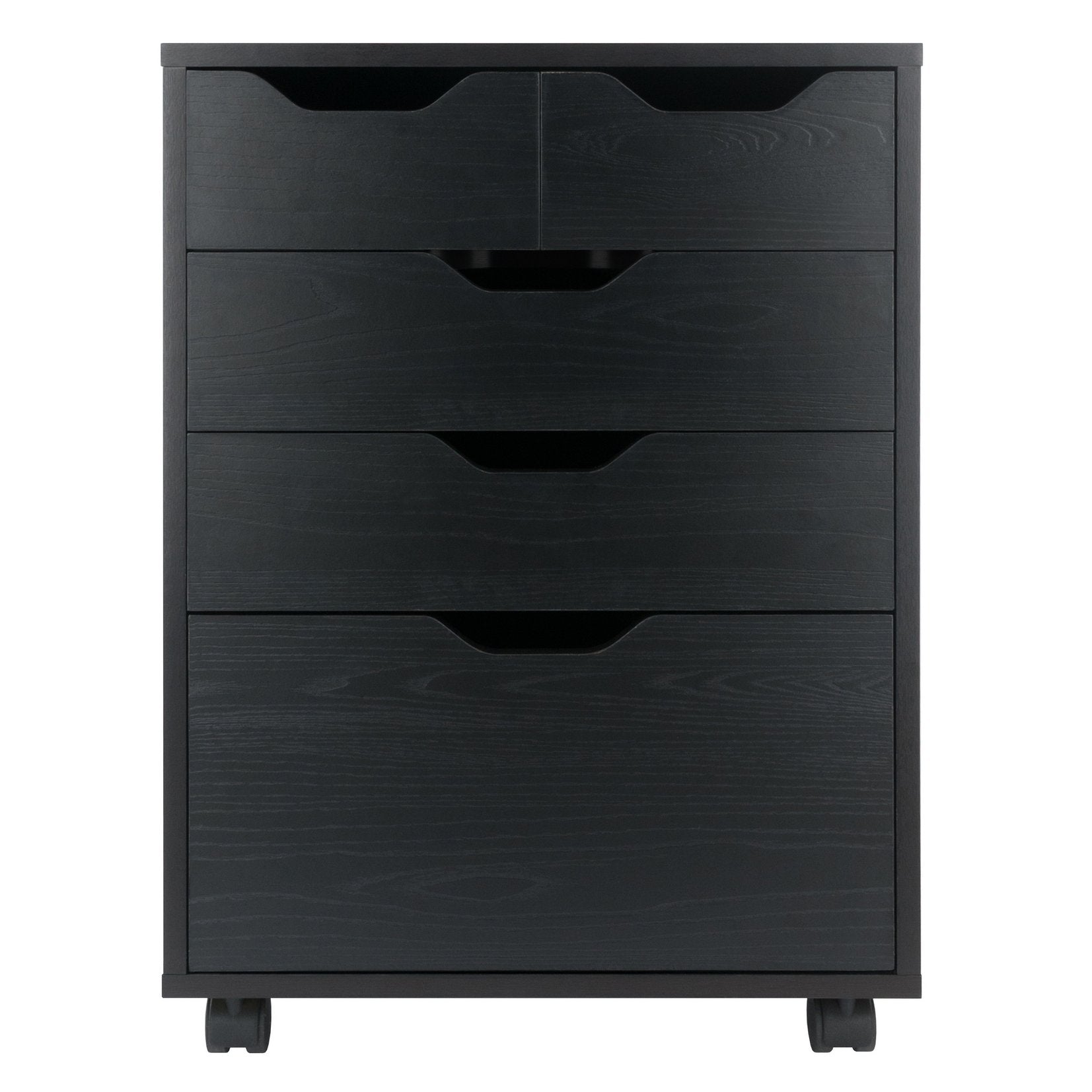 The Halifax Cabinet has a streamlined contemporary feel with two small drawers that can be used side-by-side at the top of the unit or as convenient storage bins anywhere you need. This flexibility allows for an open space free of drawer glides at the top, while the 2 middle drawers and cabinet below provide plenty of room for other storage. An ideal piece for home office, kitchen, craft area, or family room, this unit is part of the versatile Halifax Collection by Winsome Wood. Made of sturdy composite wood in a smooth black finish. It can easily be rolled on professional grade wheels. two of which lock.