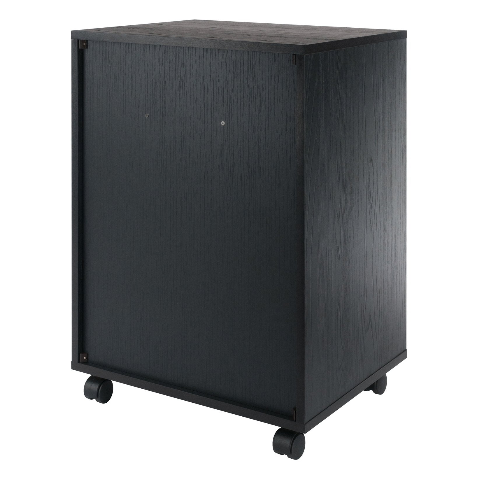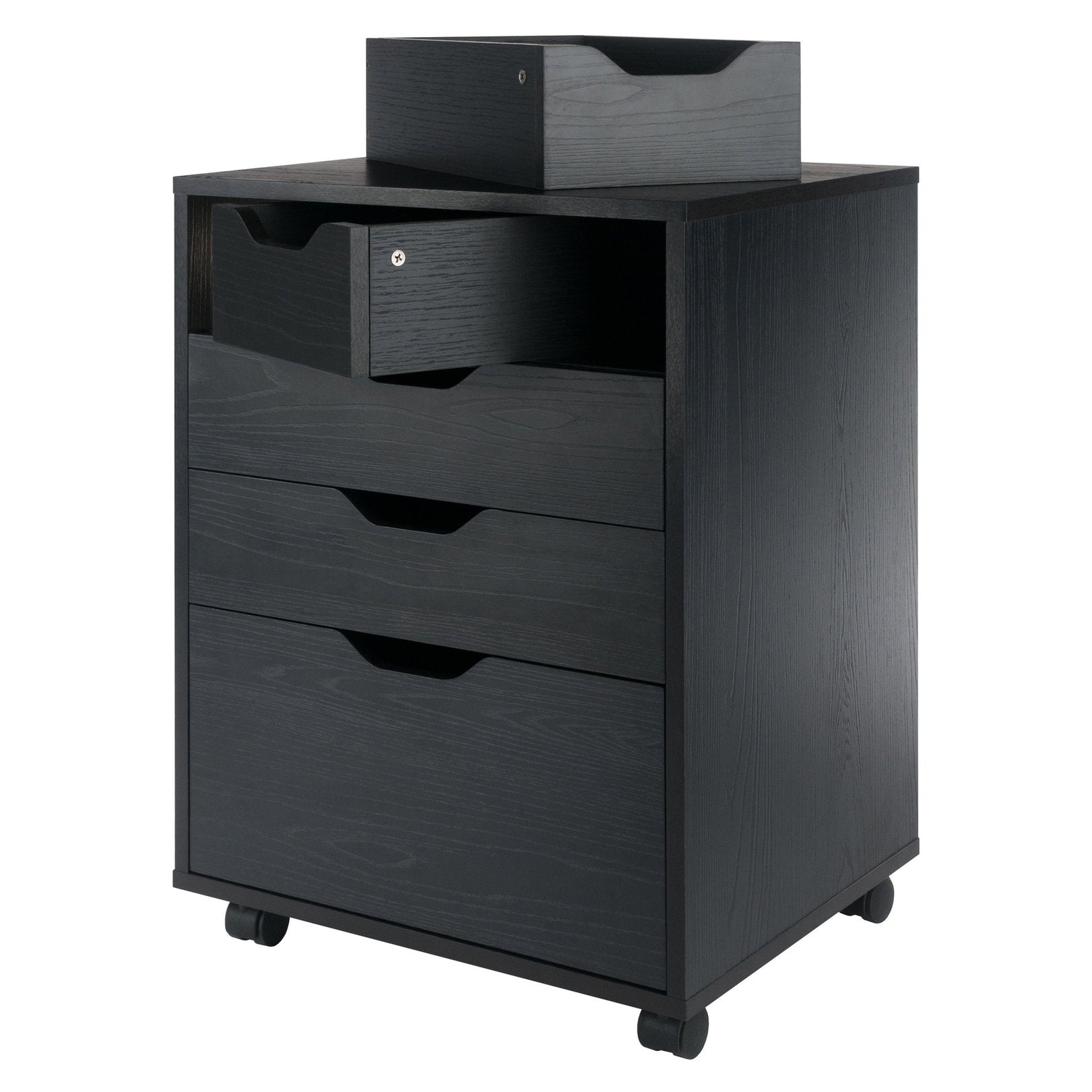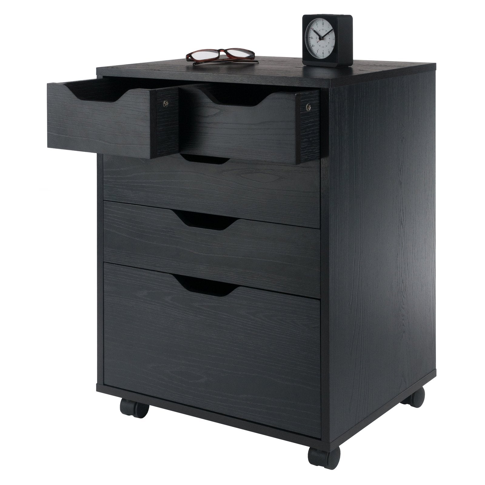 The Halifax Cabinet has a streamlined contemporary feel with two small drawers that can be used side-by-side at the top of the unit or as convenient storage bins anywhere you need. This flexibility allows for an open space free of drawer glides at the top, while the 2 middle drawers and cabinet below provide plenty of room for other storage. An ideal piece for home office, kitchen, craft area, or family room, this unit is part of the versatile Halifax Collection by Winsome Wood. Made of sturdy composite wood in a smooth black finish. It can easily be rolled on professional grade wheels. two of which lock.