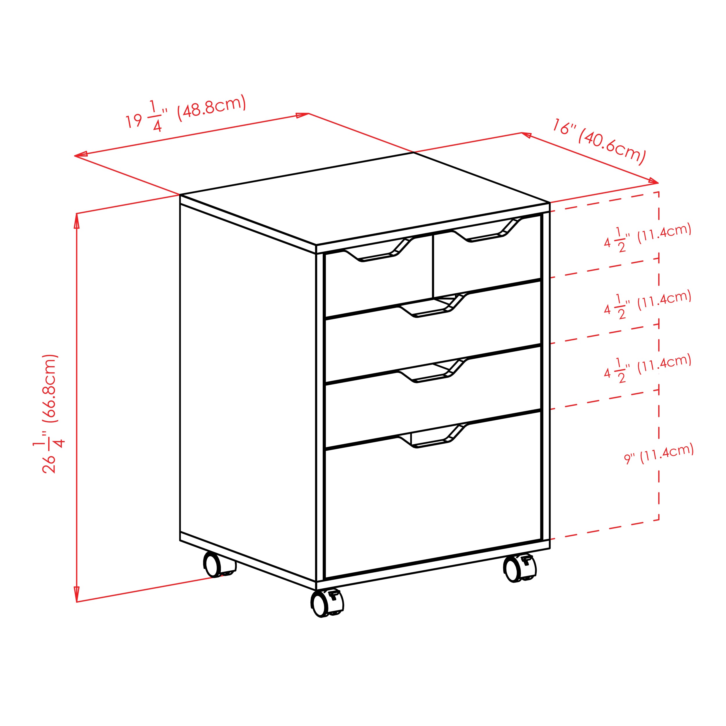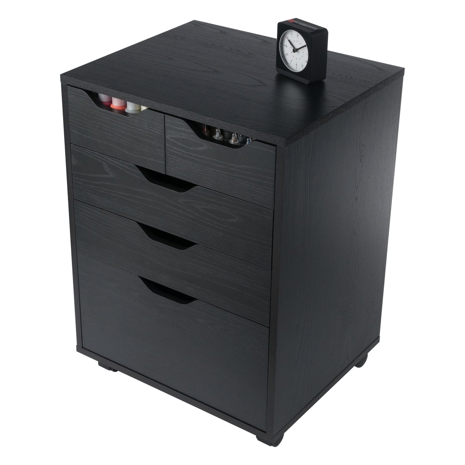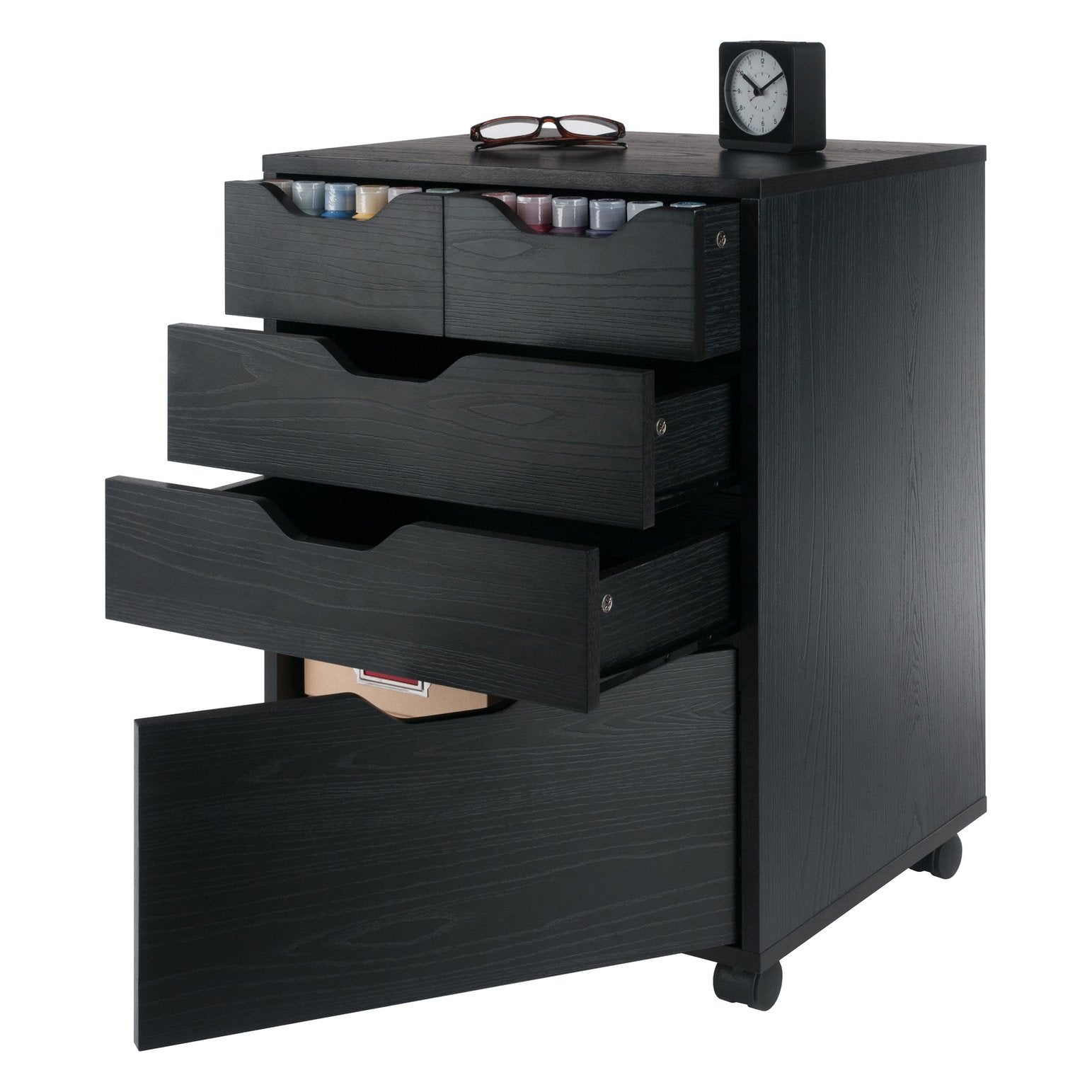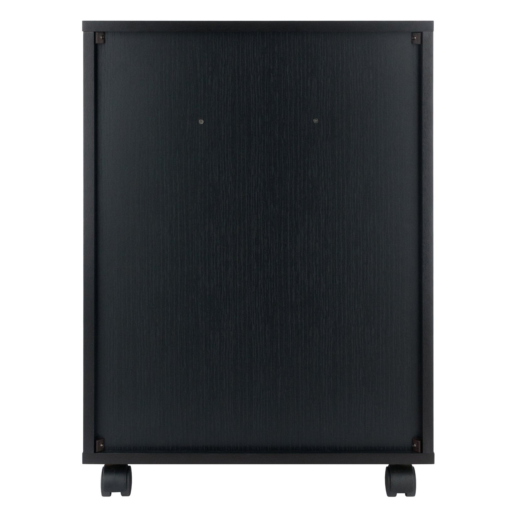 The Halifax Cabinet has a streamlined contemporary feel with two small drawers that can be used side-by-side at the top of the unit or as convenient storage bins anywhere you need. This flexibility allows for an open space free of drawer glides at the top, while the 2 middle drawers and cabinet below provide plenty of room for other storage. An ideal piece for home office, kitchen, craft area, or family room, this unit is part of the versatile Halifax Collection by Winsome Wood. Made of sturdy composite wood in a smooth black finish. It can easily be rolled on professional grade wheels. two of which lock.