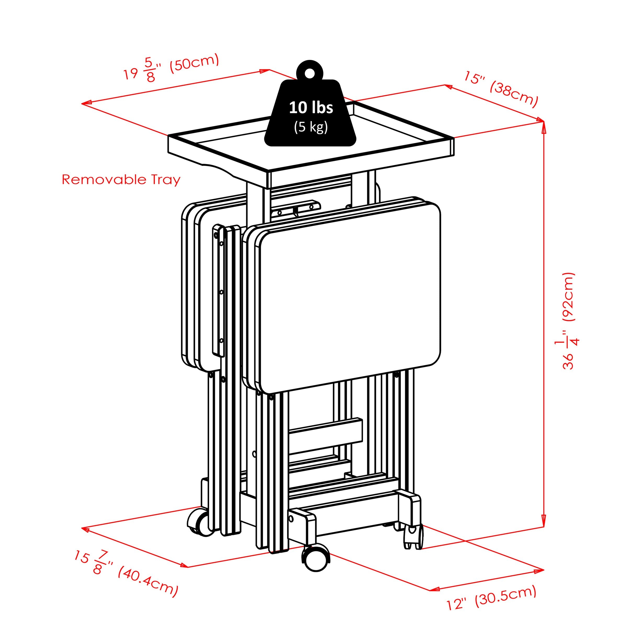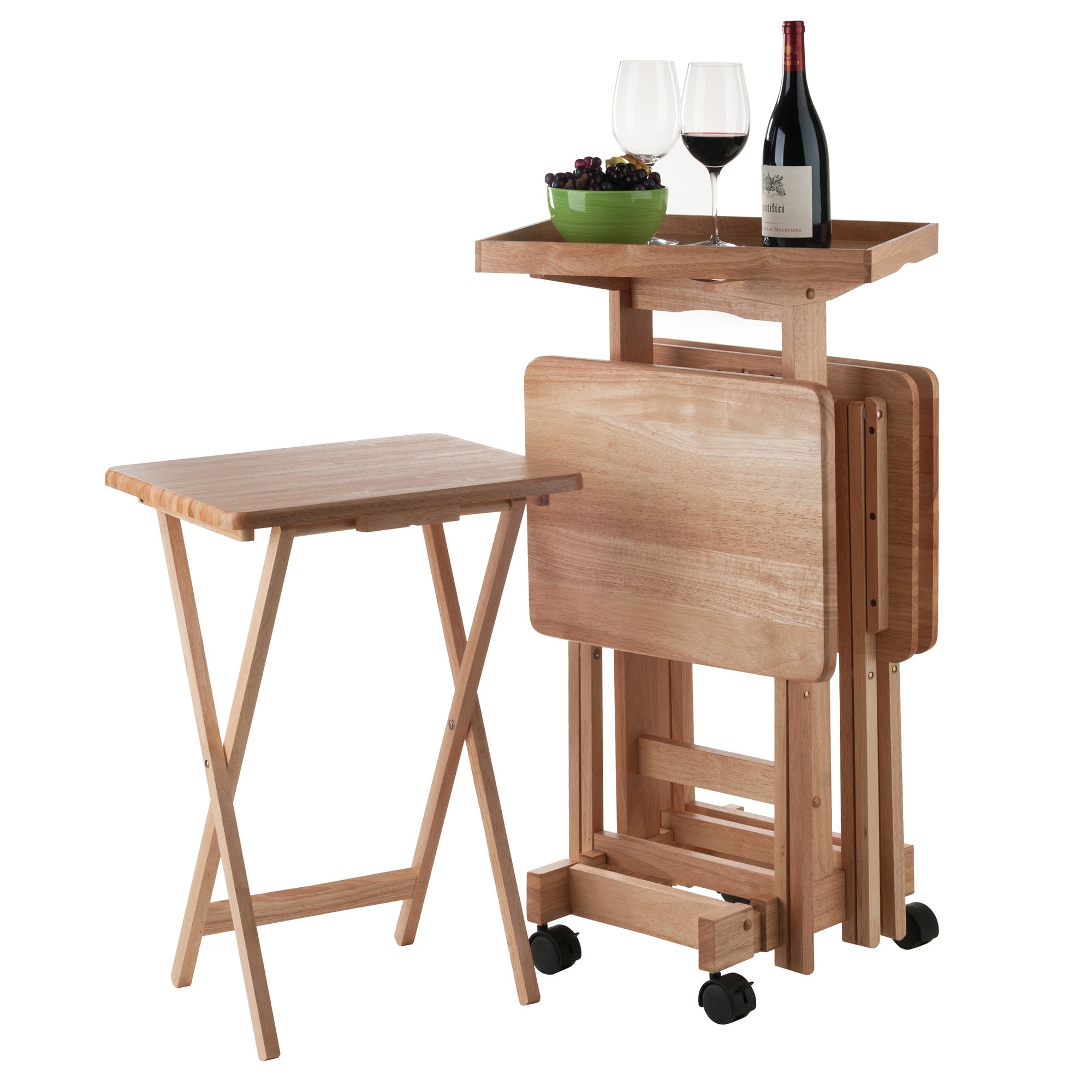 Perfect for entertaining or relaxing on the patio or in front of the TV, this set of Solid Wood Snack Tables comes with an upright stand that stores the folded tables securely and discretely when not in use. A removable wood serving tray that sits atop the stand provides extra table top space when needed. The stand rolls easily on casters, two of which lock to keep the unit stable. And with each of the 4 tables opening to a generous 19"W x 14.5"D, there is plenty of room for a meal, snacks and drinks. Made of Solid Wood in a Natural finish.