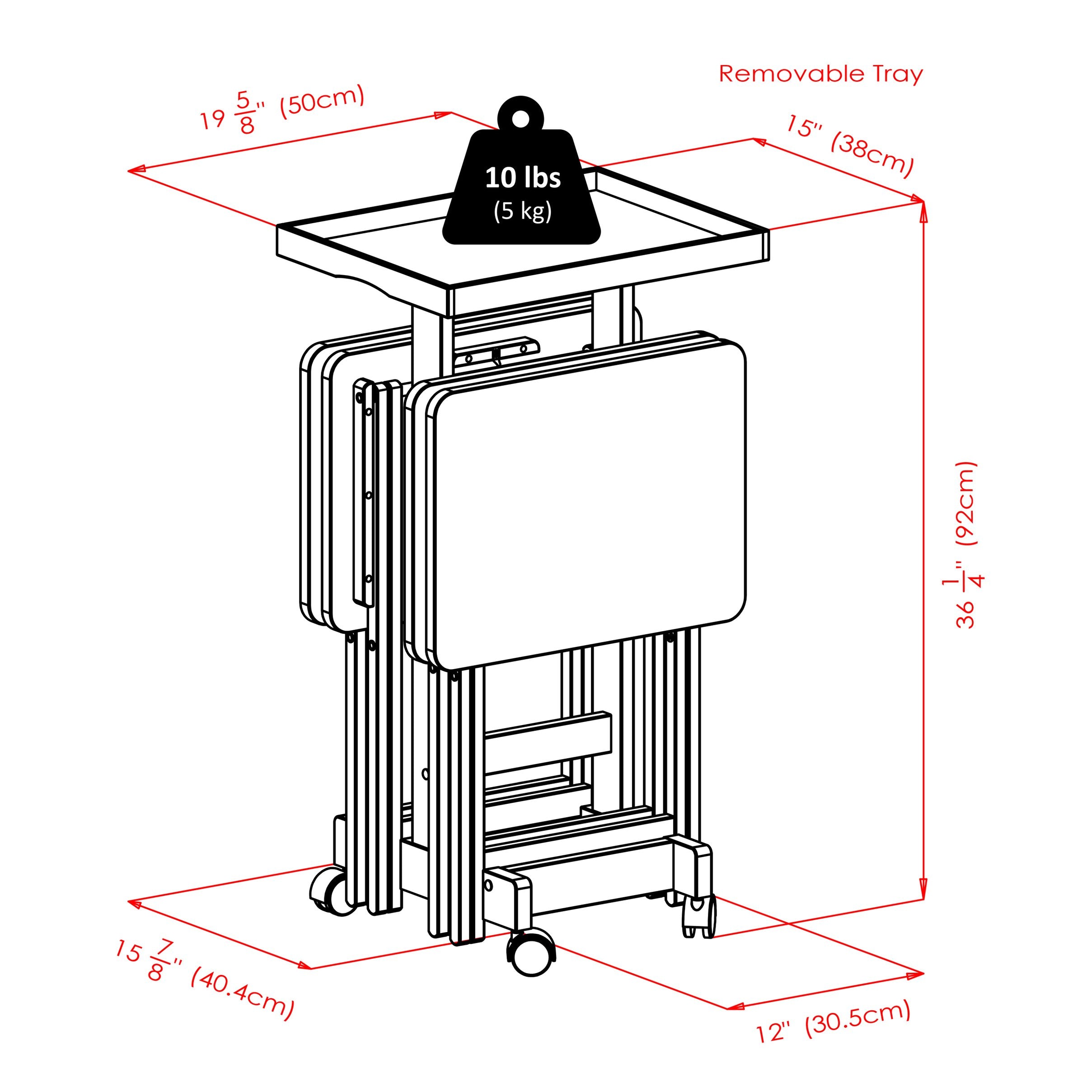 Perfect for entertaining or relaxing on the patio or in front of the TV, this set of Solid Wood Snack Tables comes with an upright stand that stores the folded tables securely and discretely when not in use. A removable wood serving tray that sits atop the stand provides extra table top space when needed. The stand rolls easily on casters, two of which lock to keep the unit stable. And with each of the 4 tables opening to a generous 19"W x 14.5"D, there is plenty of room for a meal, snacks and drinks. Made of Solid Wood in a rich Walnut finish.