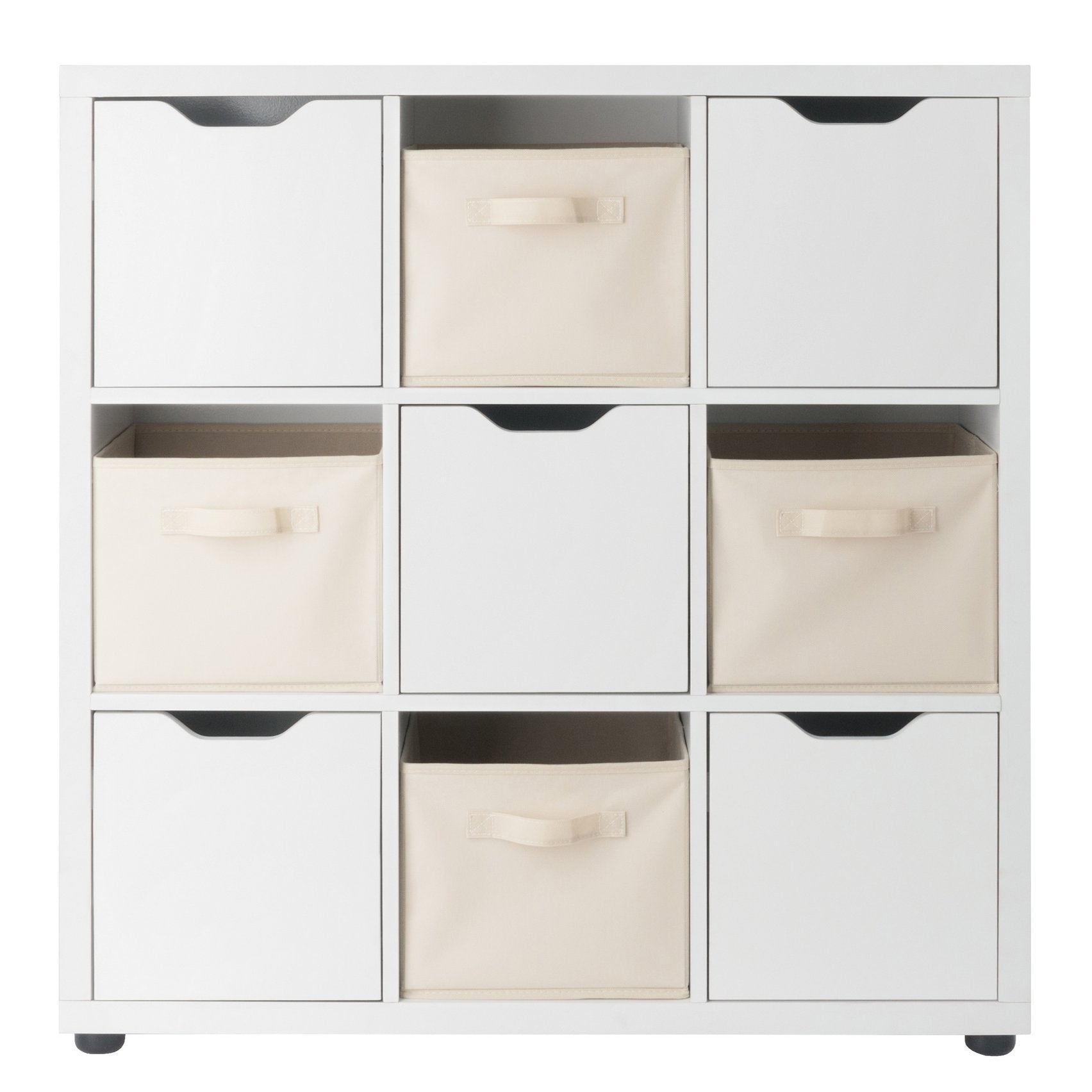 The Julian 3x3 Storage 5-Piece Cabinet Set by Winsome Wood is the answer to any and all organizational needs. With a total of 9 spacious compartments, the cabinet is ideal for a mudroom, garage, craft area, family room or kids' bedrooms. Use all the compartments for storage, or combine them with display in the open cubbies. The unit comes with a set of 4 foldable baskets in a complementary beige color, providing yet more way to keep clutter out of sight. Made of sturdy composite wood, the cabinet has a clean, white finish and comes with attachable rubber feet to prevent floor scratches.