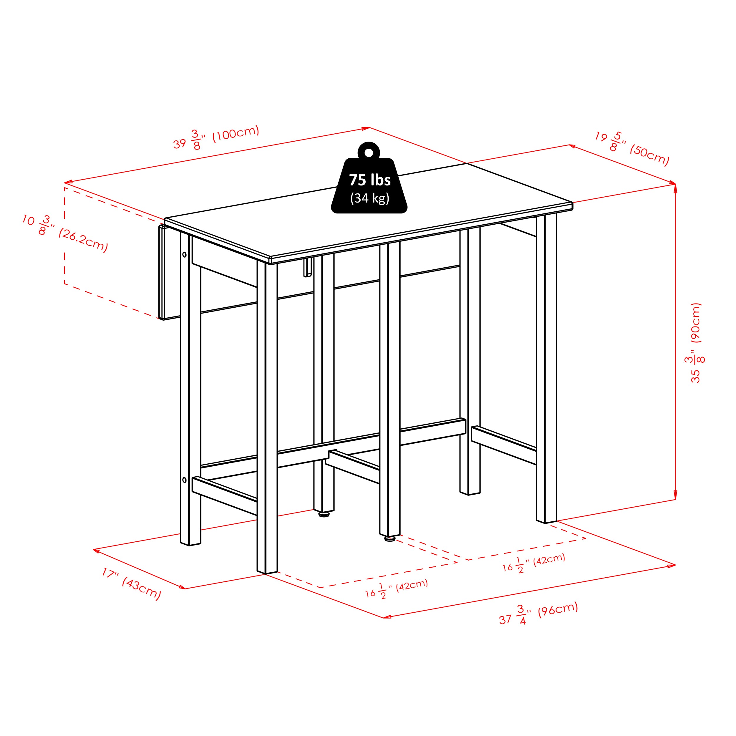 - Drop leaf 39.4"W x 10.3"D.