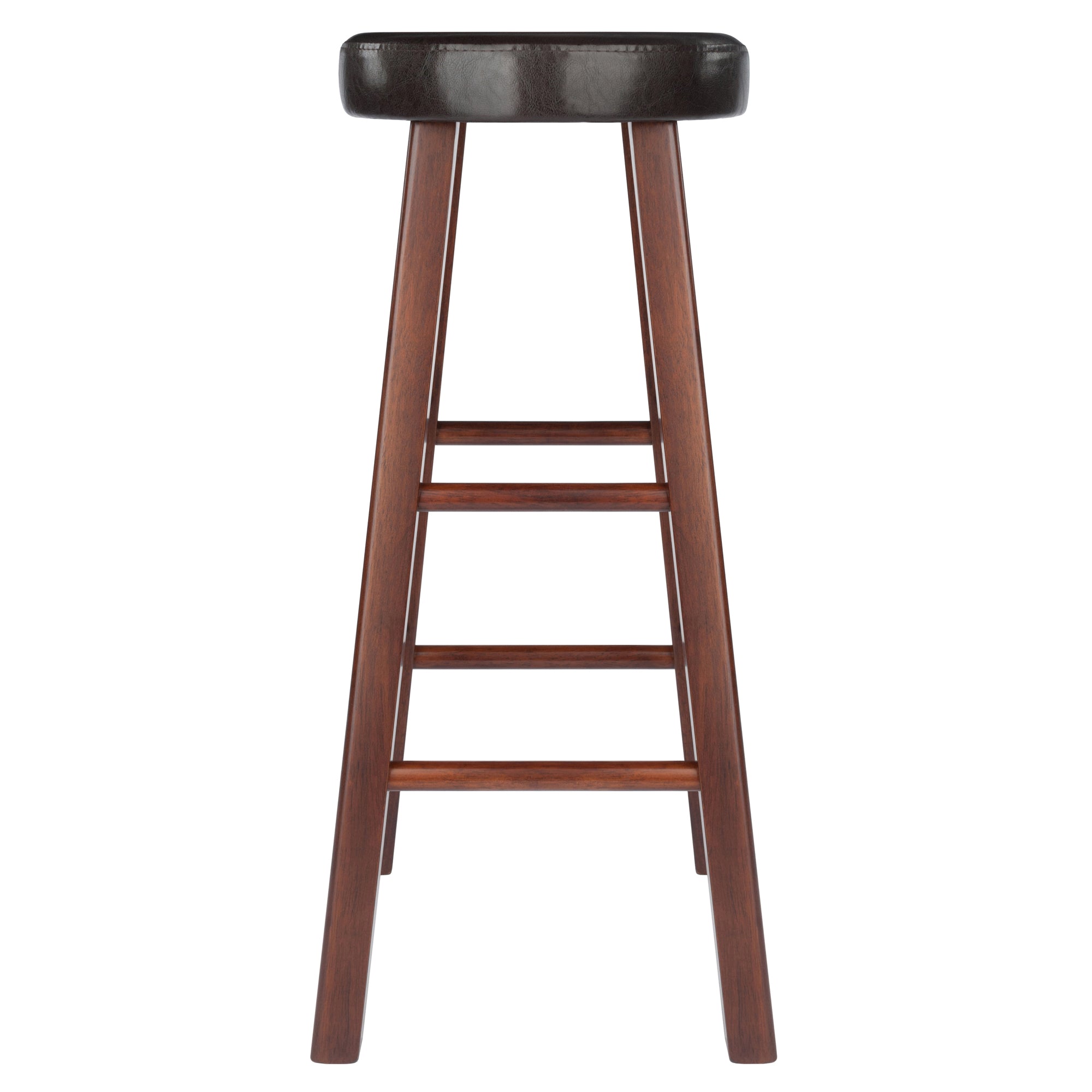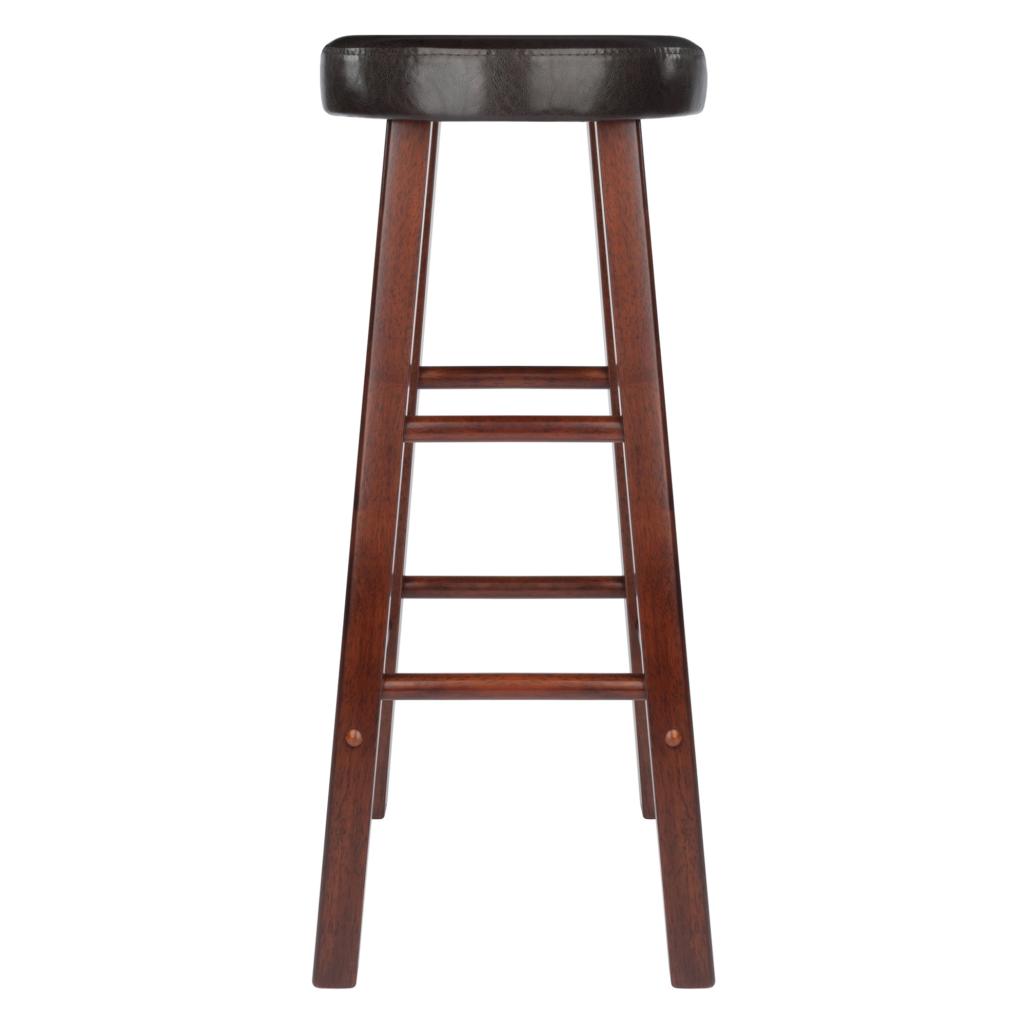 The Winsome Maria 2-PC Bar Stool Set is a must-have for comfortable dining at a high table or relaxing at a home bar. Each stool has a 2.76" thick cushion seat covered in Espresso faux leather. The Solid Wood frame, finished in Walnut, offers stability and strength. Assembly required.