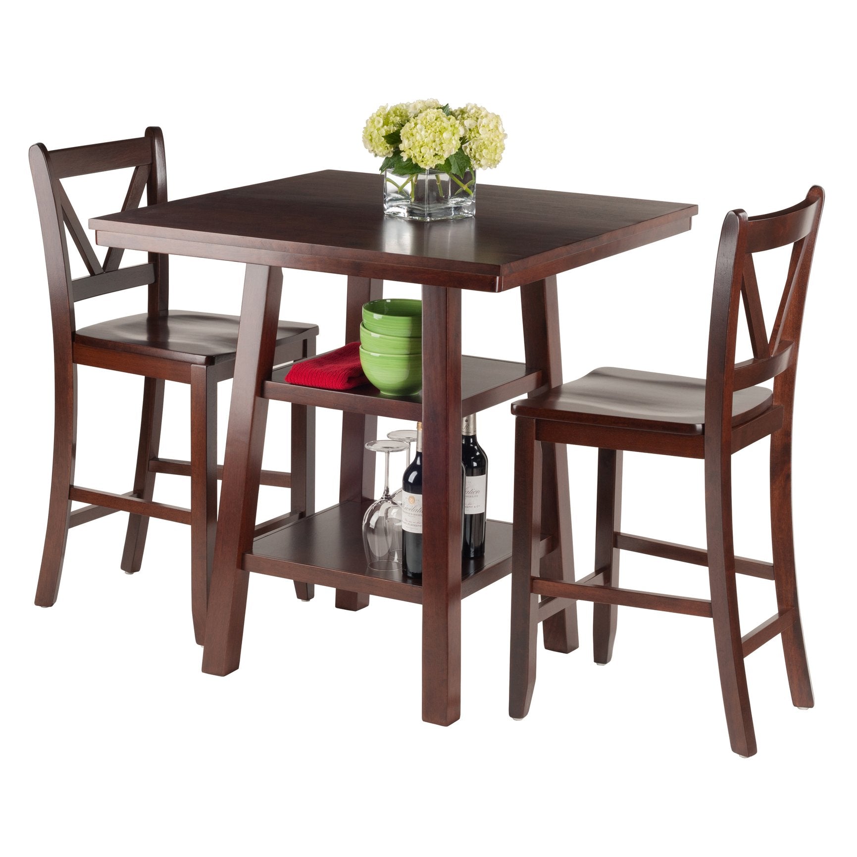 The 3-piece Orlando High Table and V-Back Stool Set combines simplicity and function, reminiscent of a country home antique. The set is a great addition to a dining area, eat-in kitchen, or family room for cards and board games. Or pull up one of the stools and use the table as a desk or workspace. The table features 2 shelves that offer generous storage space for dishes, glassware, and other dining accessories. The solid wood V-Back Stools add a splash of style to the set's warm and homey character. Finished in a rich walnut, the table is made of solid and composite wood for long-lasting stability. Overall table size is 33.8"W x 33.8"D x 36"H.