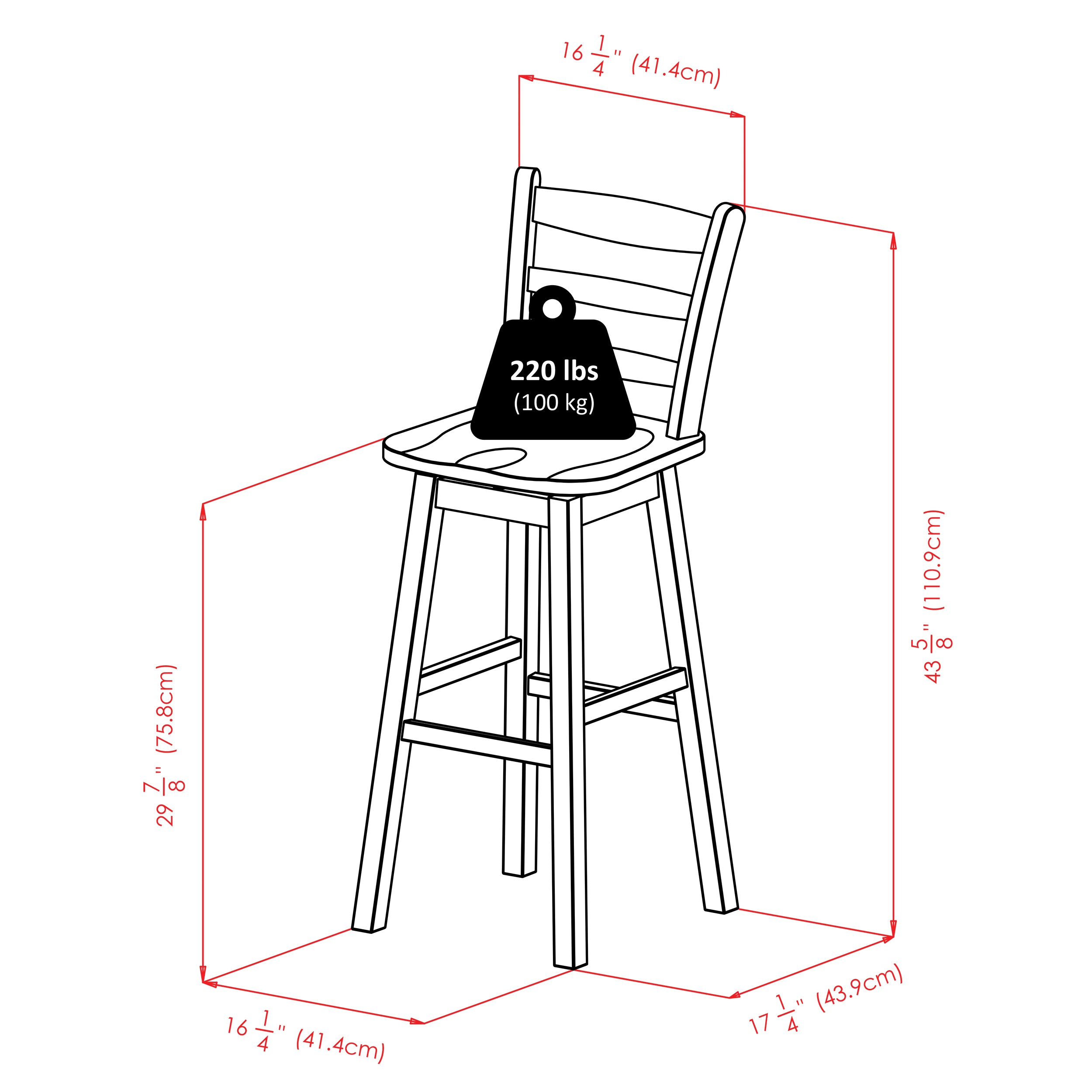 Classic design and solid wood are the hallmarks of the Scalera Ladder-Back Swivel Bar Stool. The gentle arcs of the slats on the ladder back, sturdy squared legs with supports to use as footrests, and a wide seat that swivels 360 degrees add the finishing touches. A perfect seating choice for your home bar, den or living room. Finished in a rich Walnut, with weight capacity up to 220 lbs.