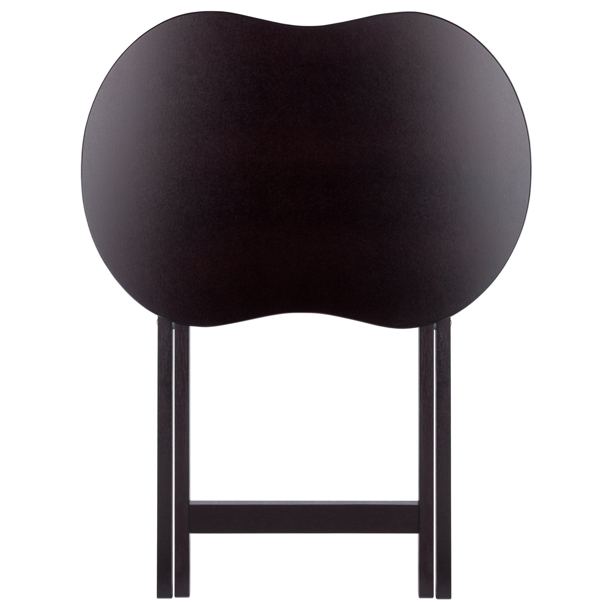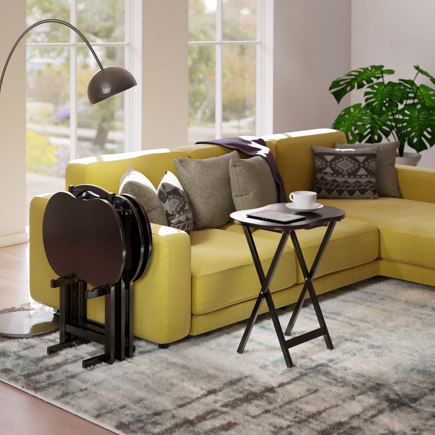 Great for keeping in dining room, kitchen or game room, the 5-Pc TV Table is great to have for work and play time. With "Peanut" tops, these wood TV Tables can easily hold a large meal with style. An upright stand stores them when not in use.