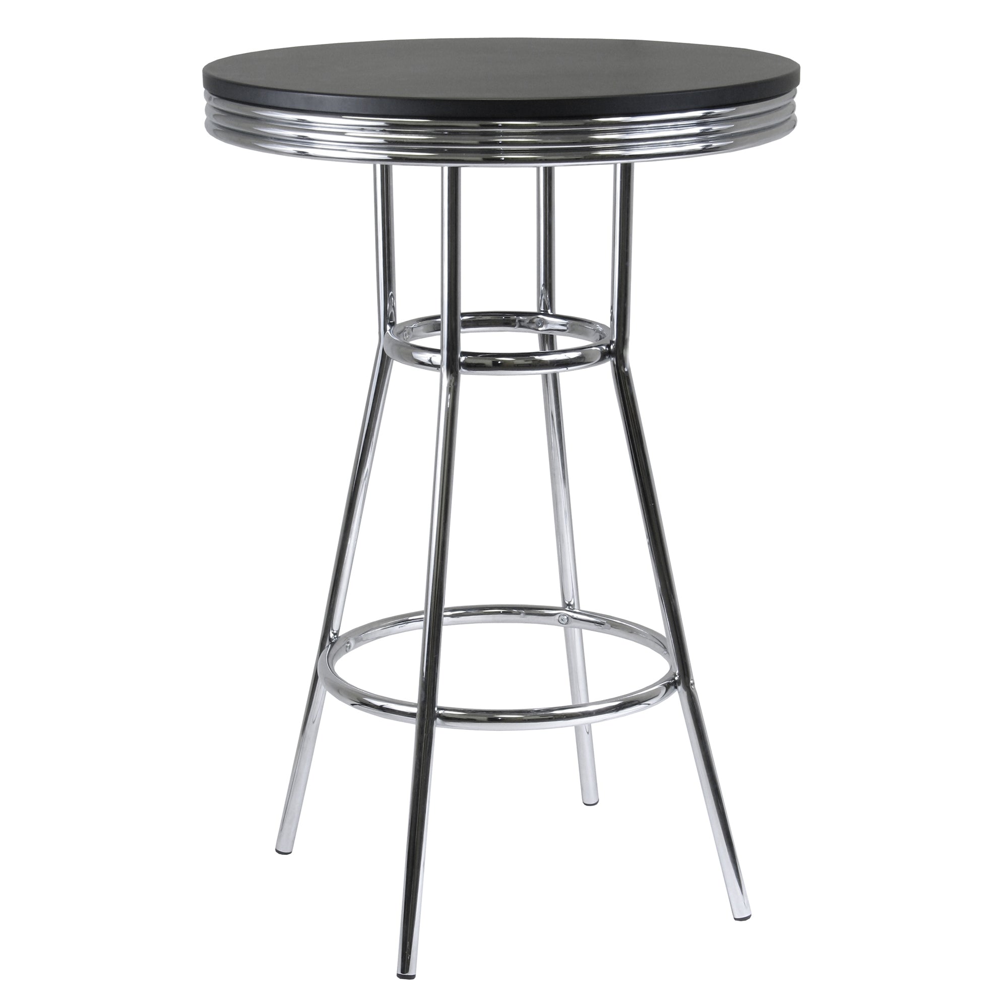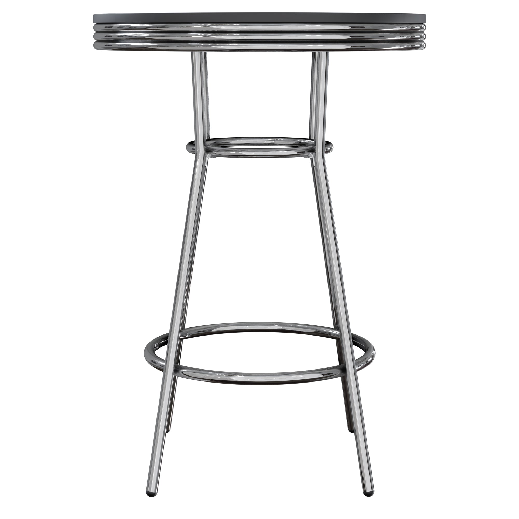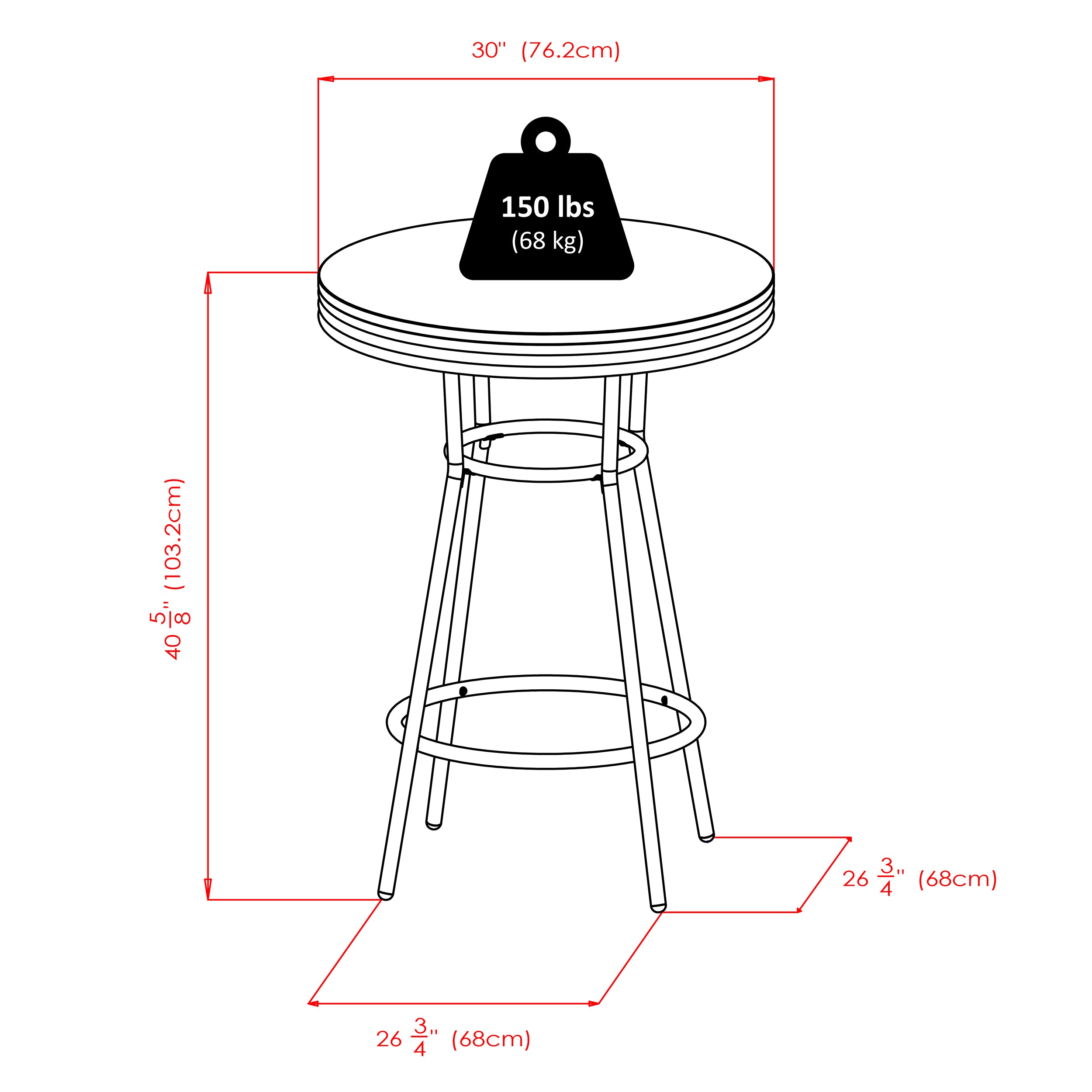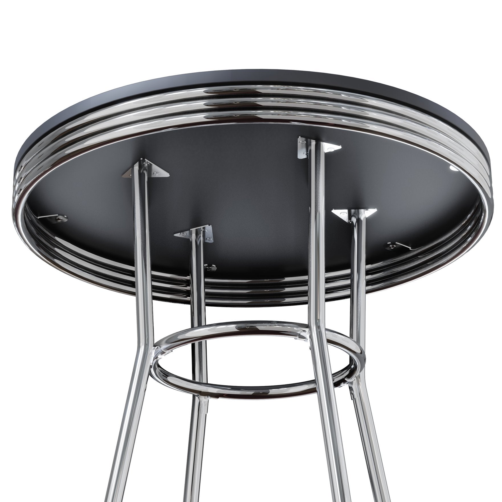 Summit retro pub table has a frame a legs in a polished chrome with a black composite wood and PVC top. The round table top is 30" to accommodate dinner plates , beverage ware and condiments. The matching swivel barstools are a perfect compliment to this table.