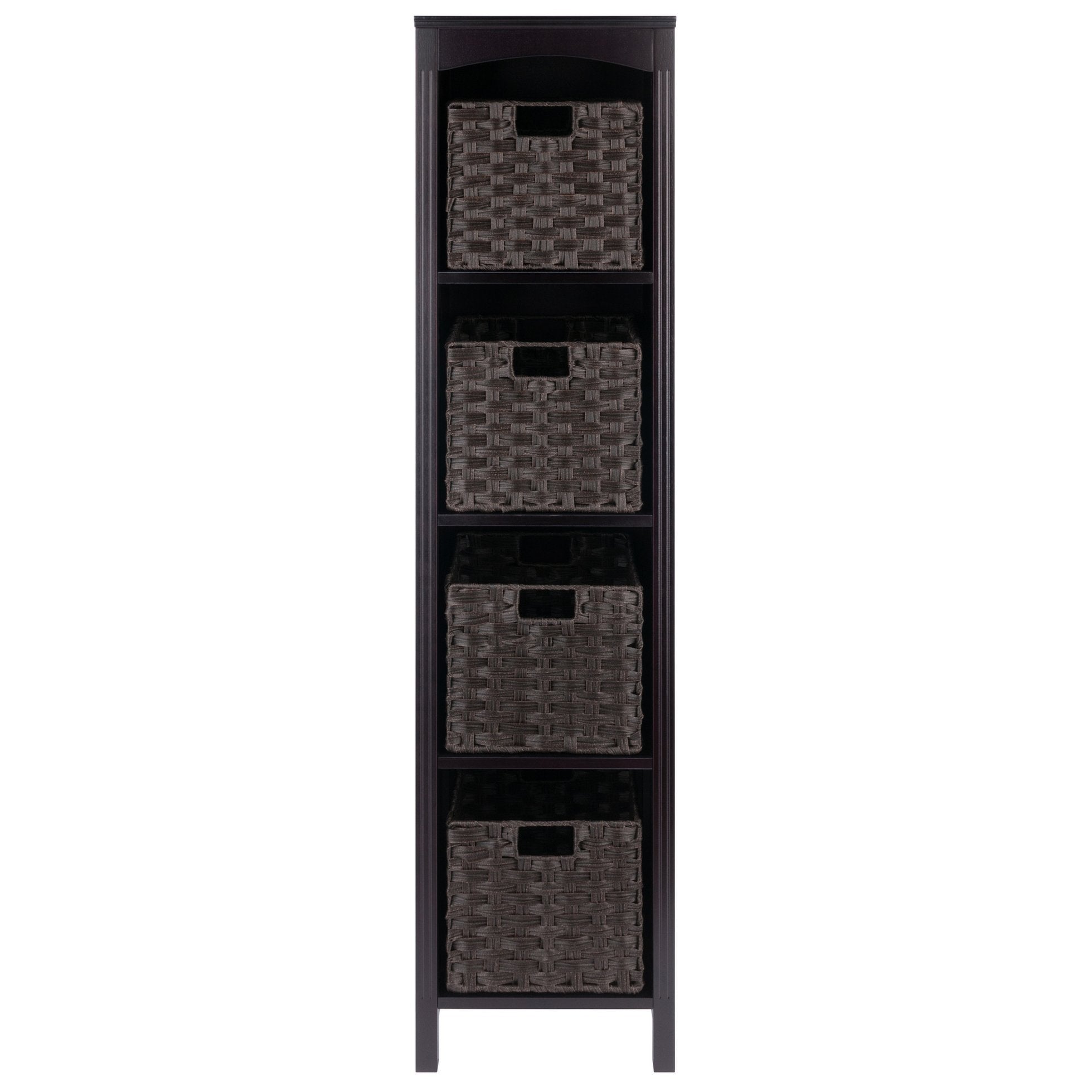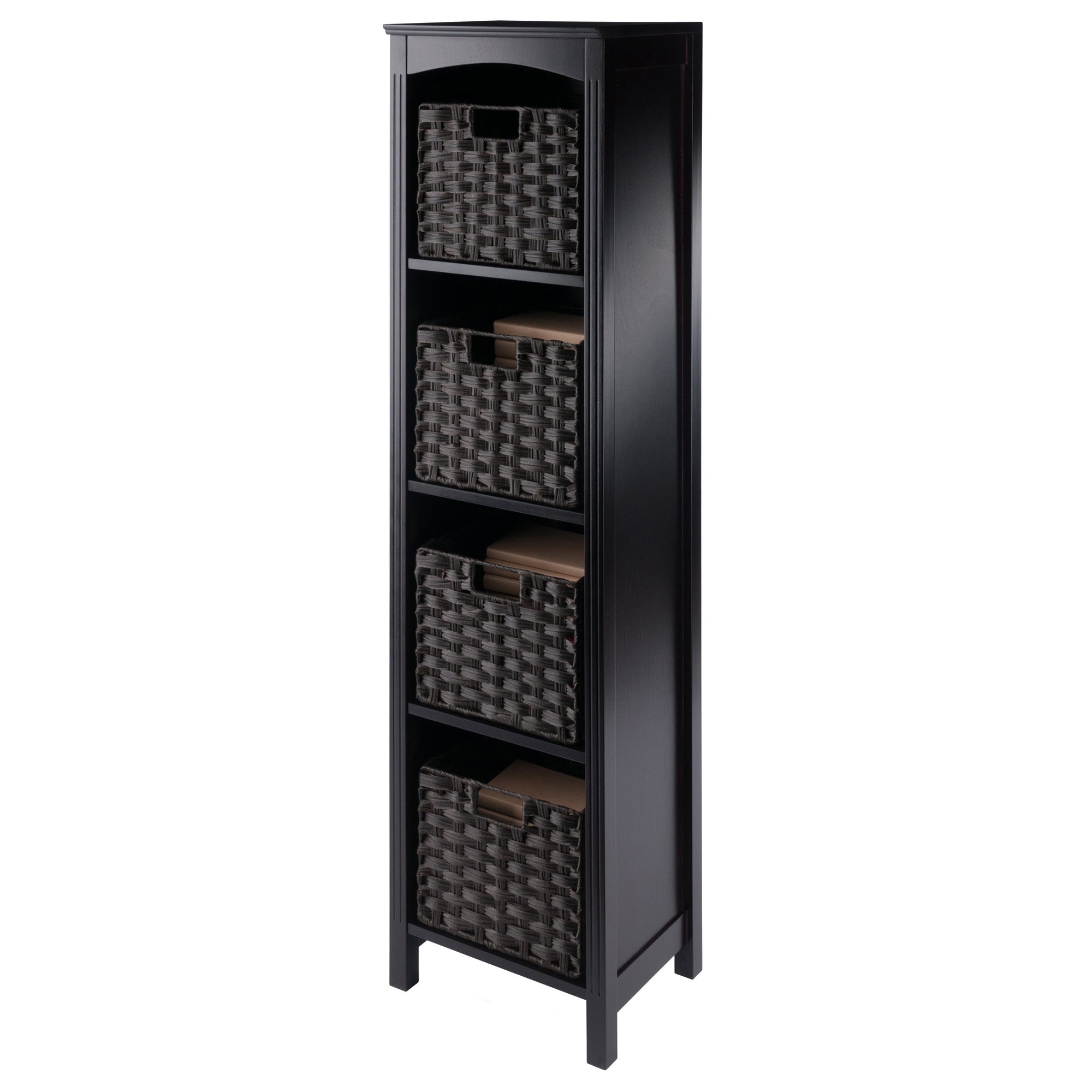 Narrow shelf ideal for displaying your treasure or storage your books. Simple and elegant design that includes 4 baskets for added organization.