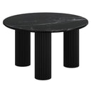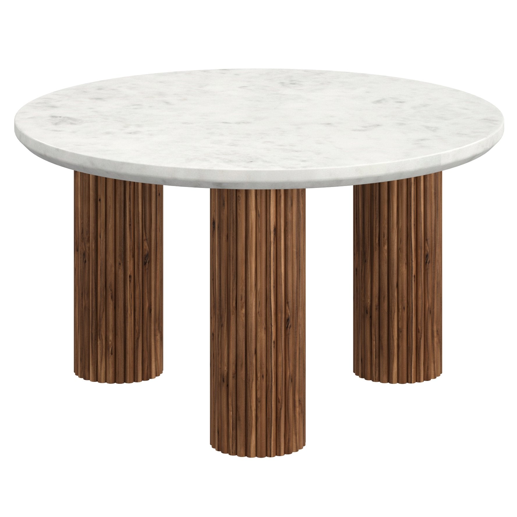 - Triple pedestal solid mango wood reeded base in a walnut finish