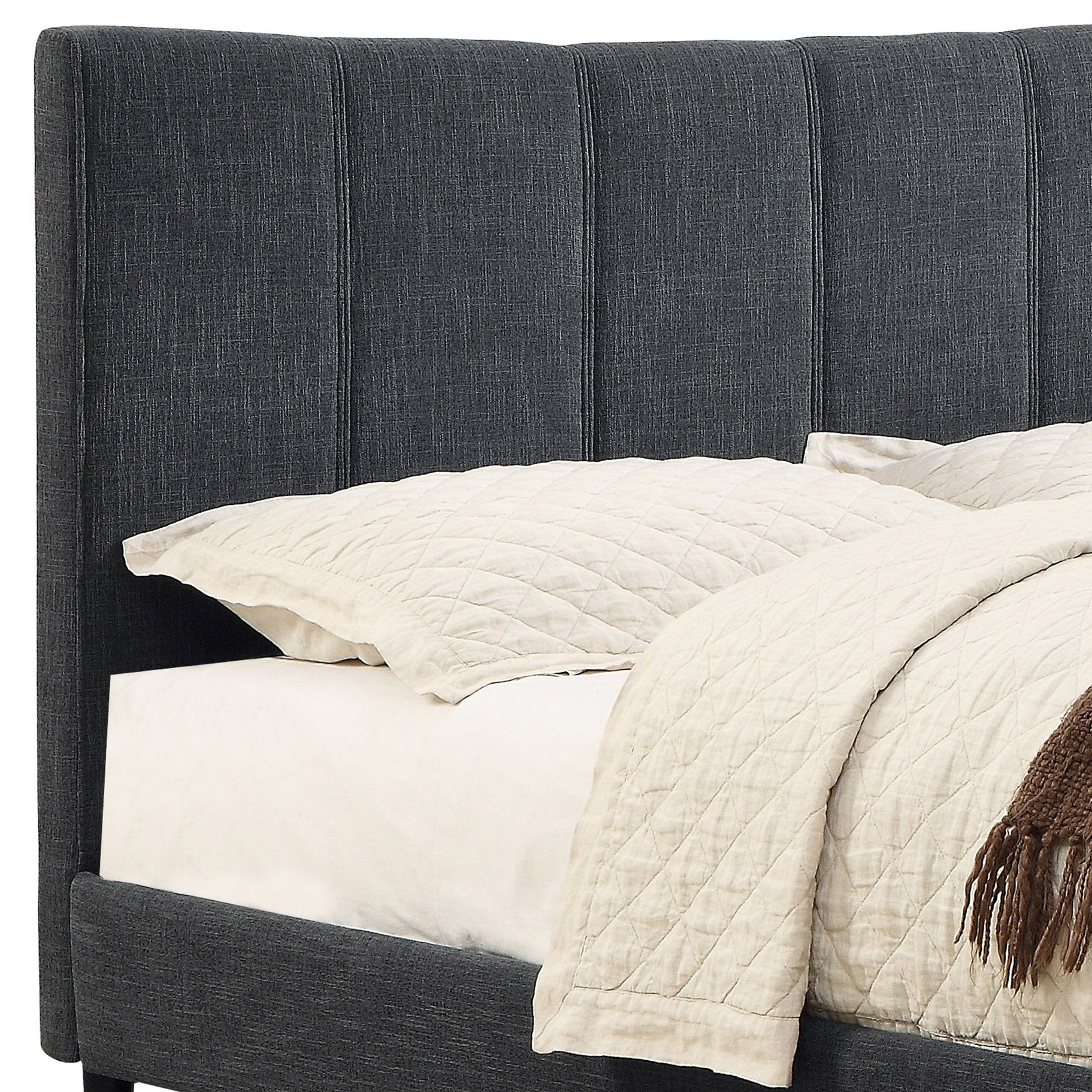 - Textured, linen-look fabric with vertical panel stitching on headboard