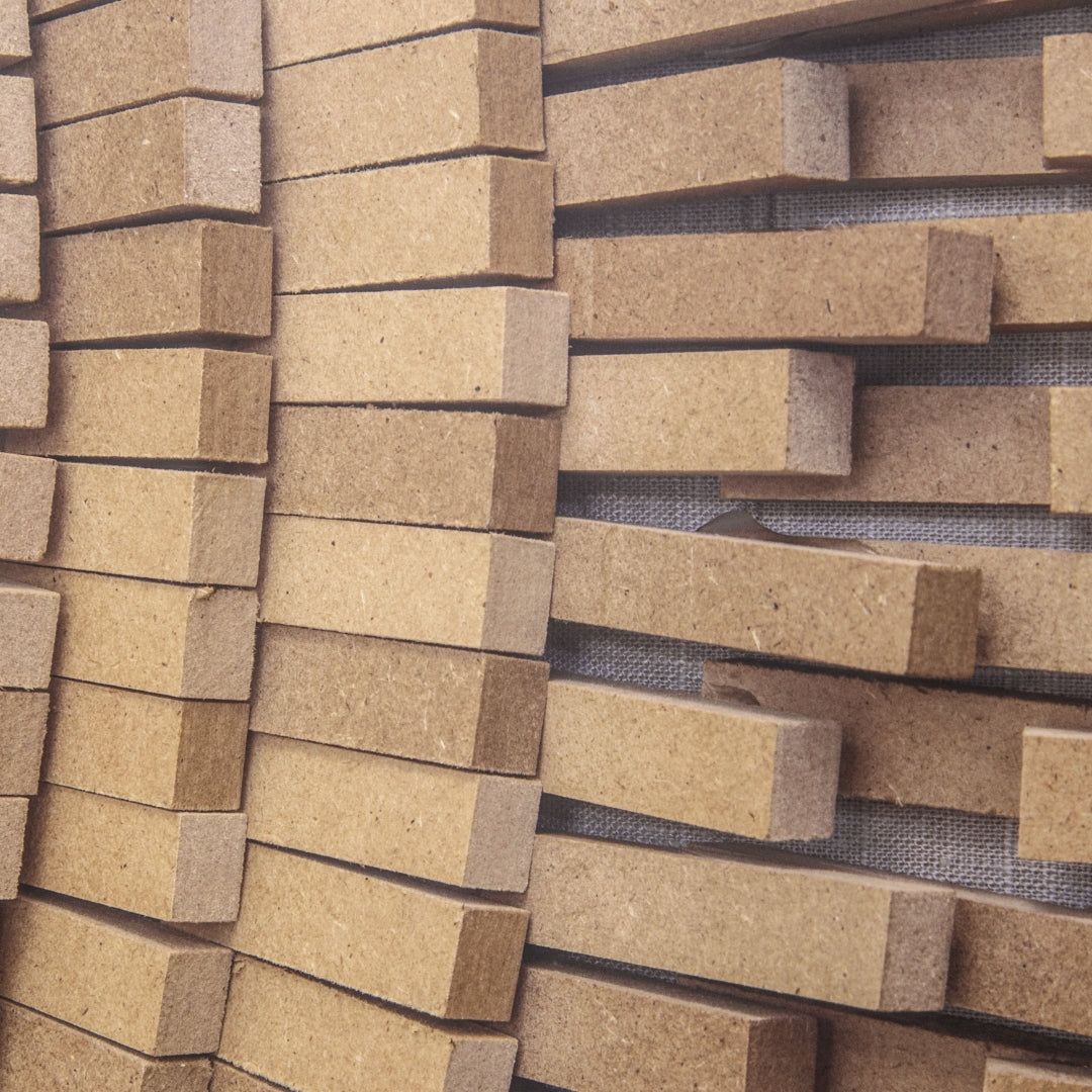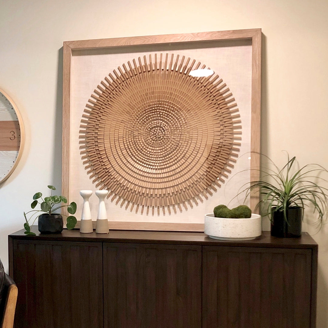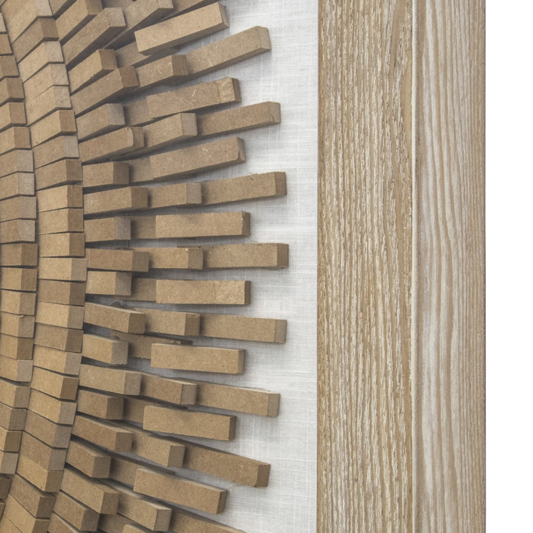 - Feature #1: Shadowbox Featuring Design Made Of Pieces Of Natural Toned Wood Which Are Staggered And Hand Stacked In A Circular Shape