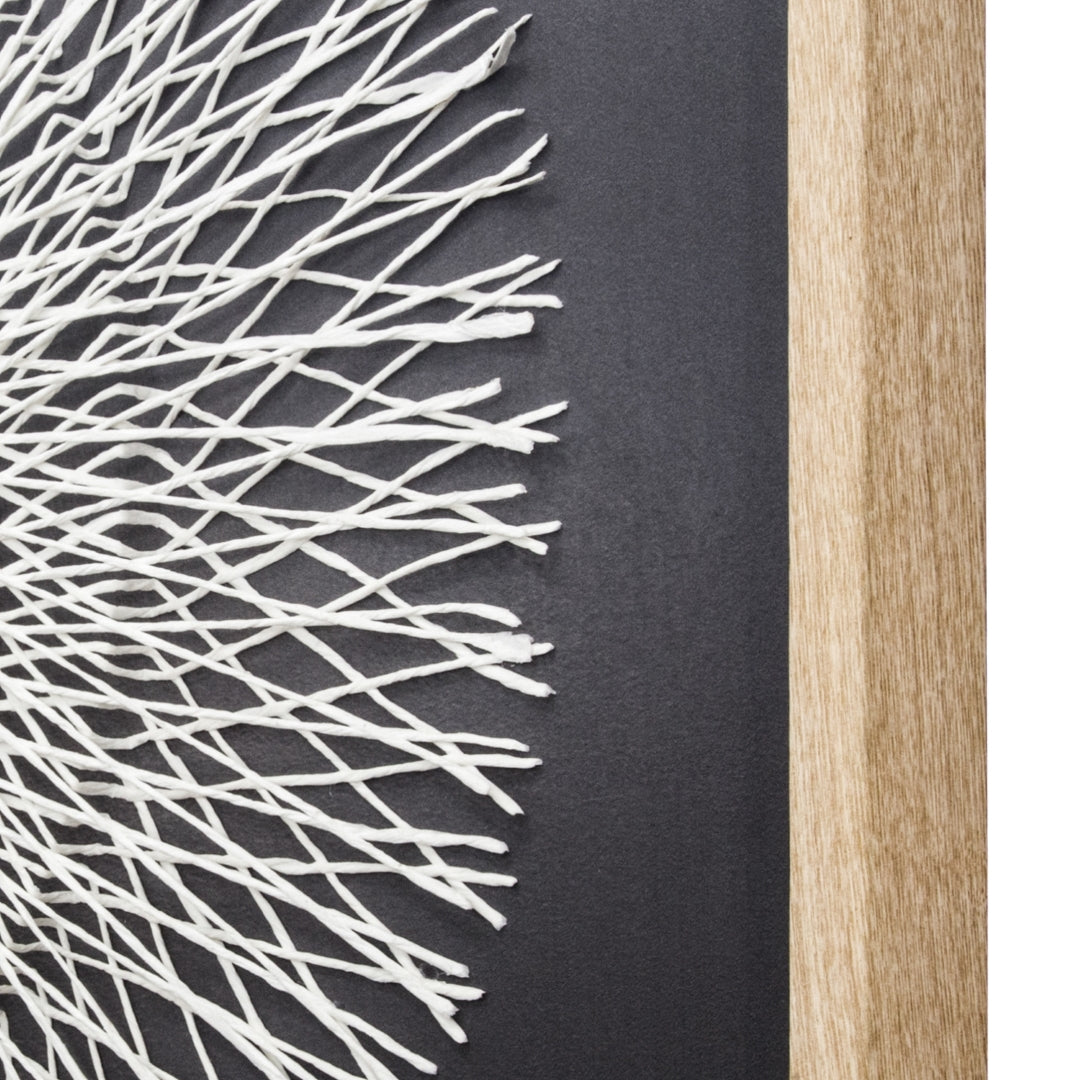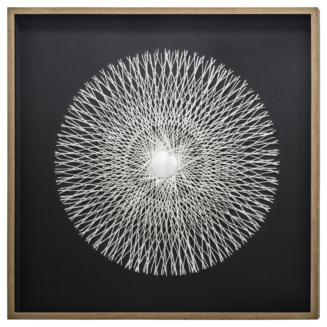 - Feature #1: Shadowbox Encasing Circular White Twine Design With Reflective Center On A Dark Linen Background