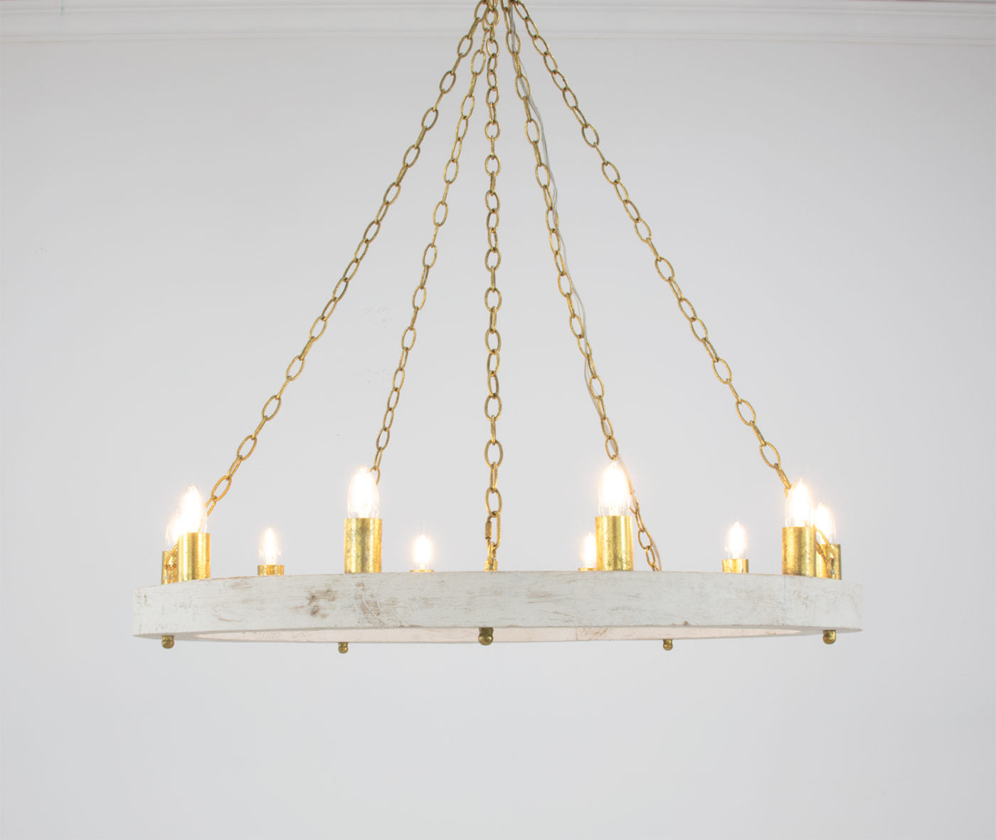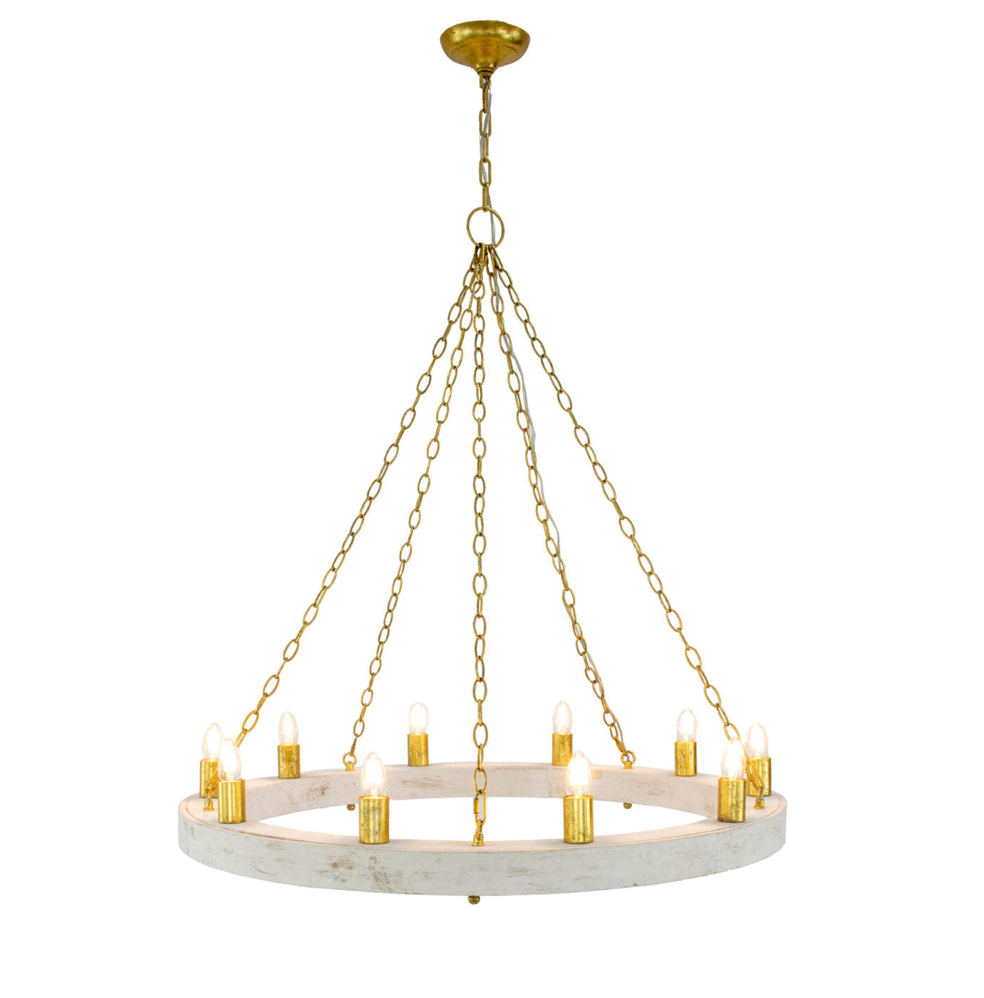 - Finish: Distressed White Oak Finish with Gold Leaf chain and canopy