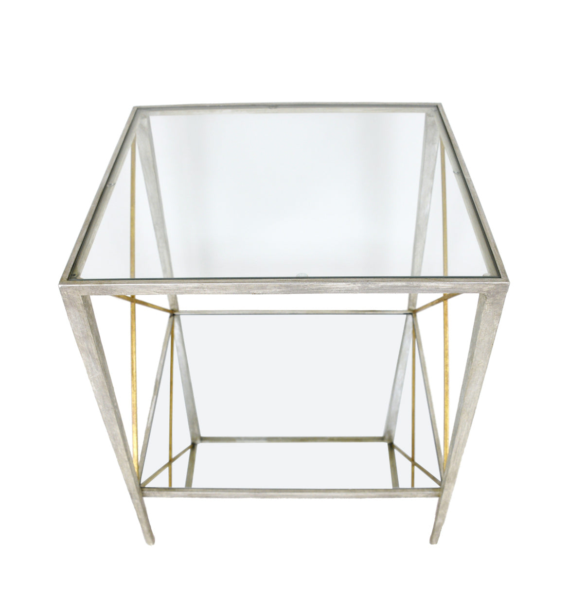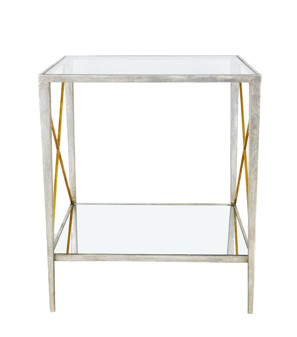 Handmade antiqued silver leaf side table with metal frame. Gold leaf accents on the X. This side table has a tempered glass top and mirrored bottom.