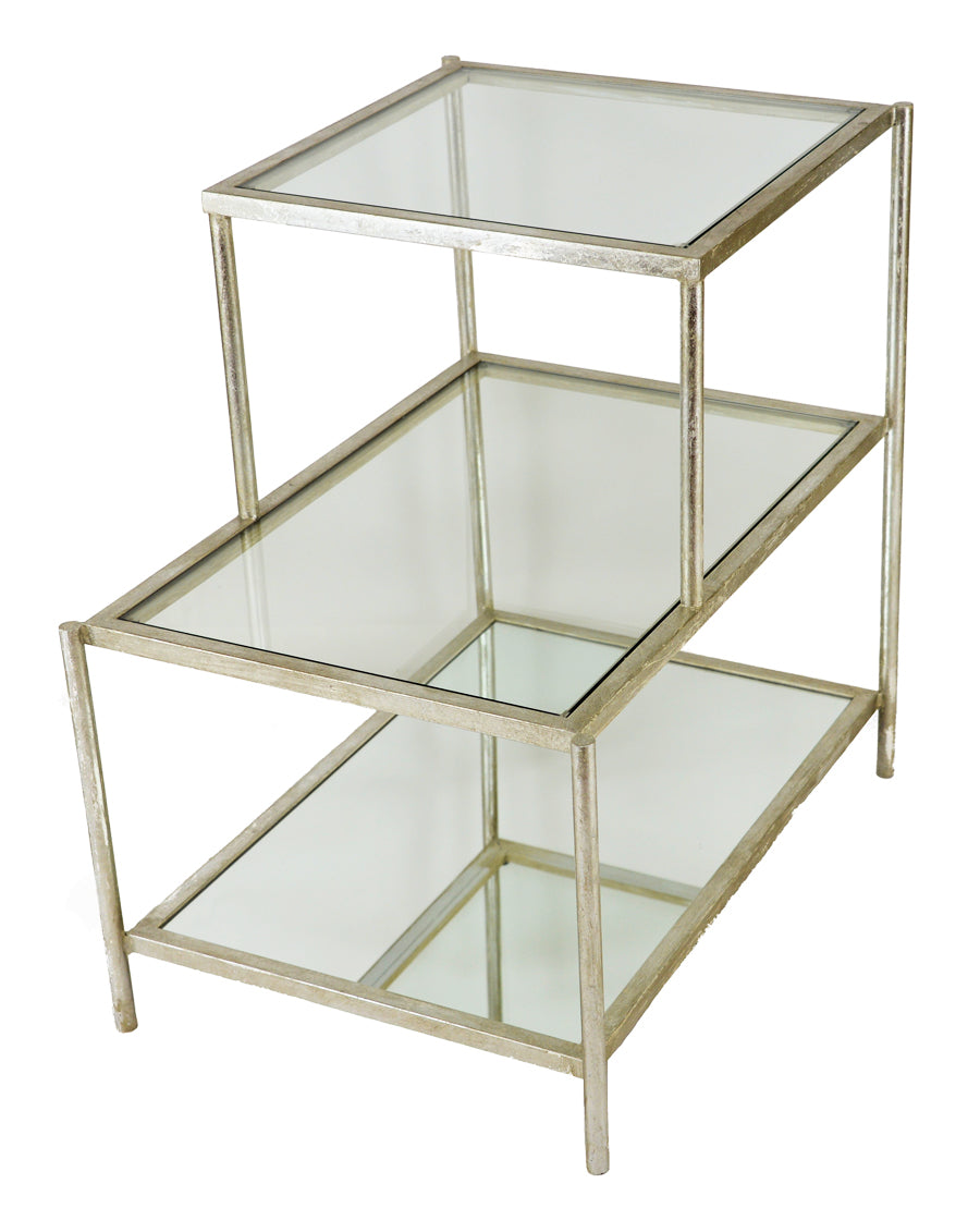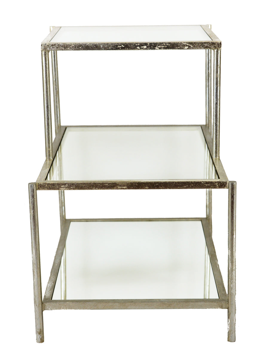 This beautiful side table is handmade silver leaf, top 2 tier with tempered glass top and bottom tier with mirror top.