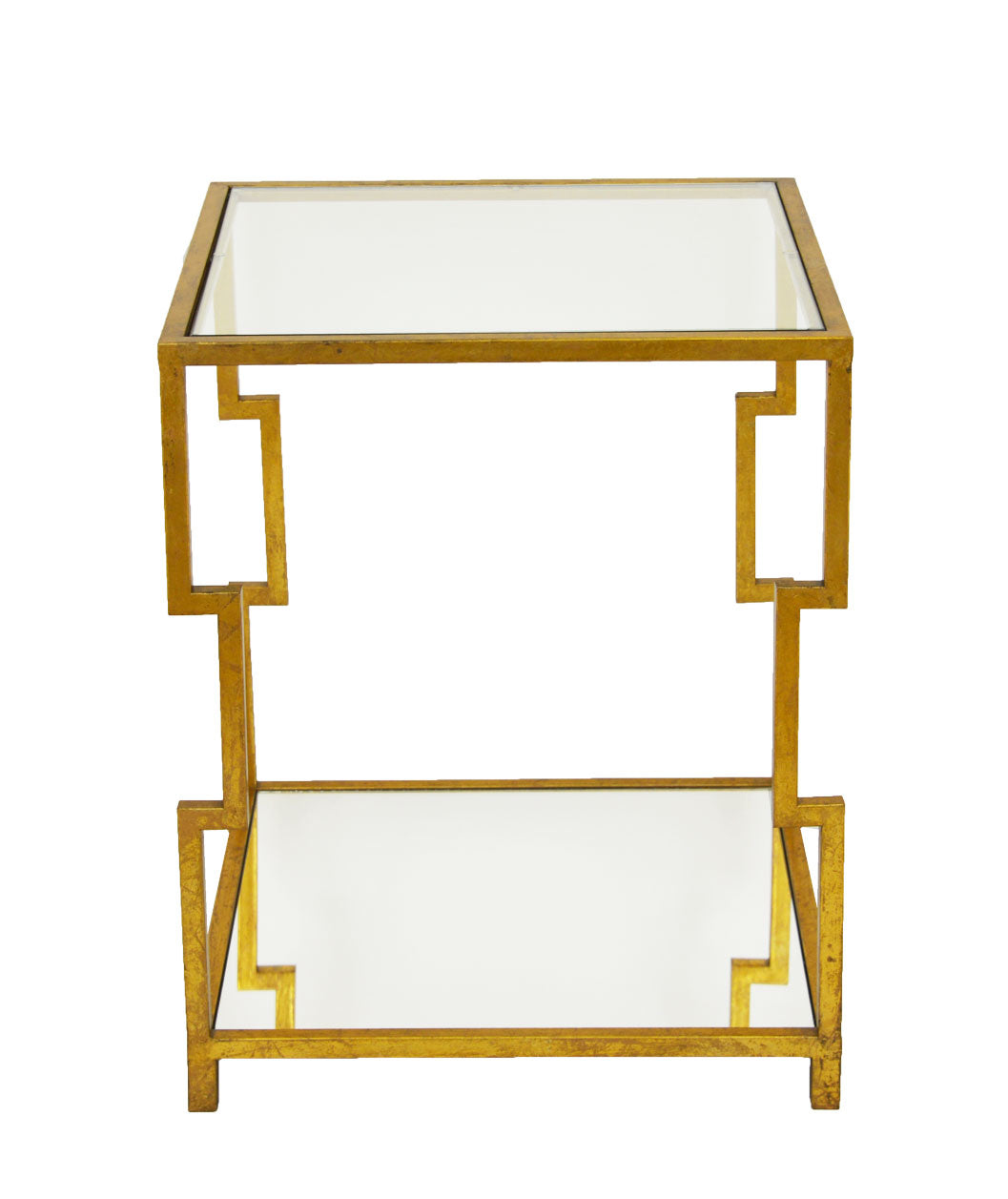 Handmade gold side table with metal frame. With tempered glass top and mirrored bottom.