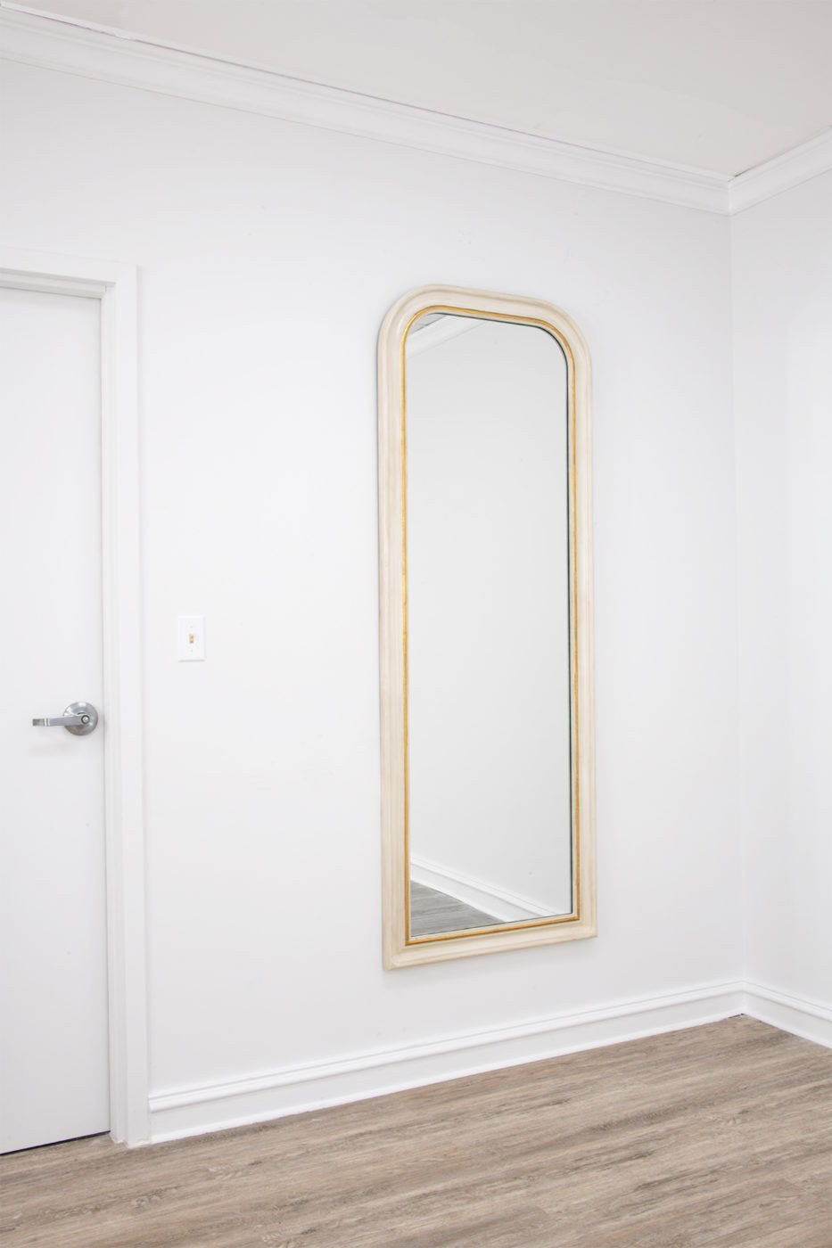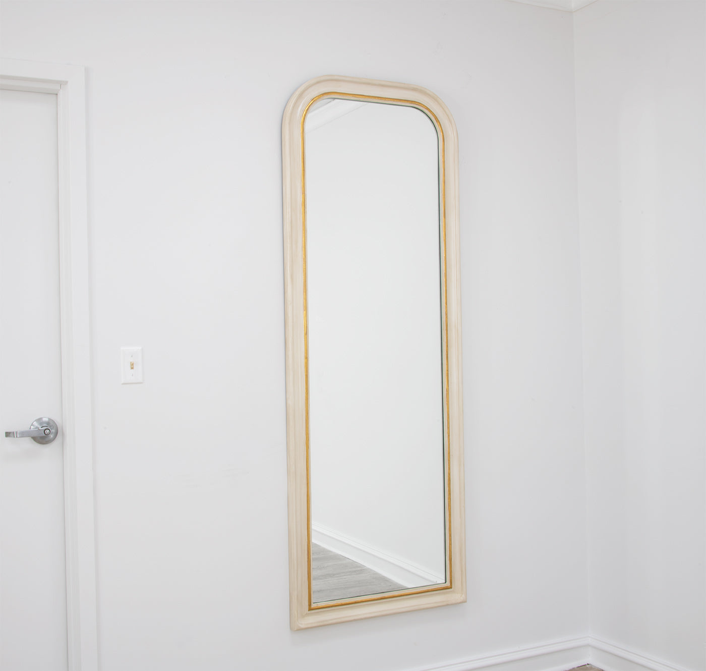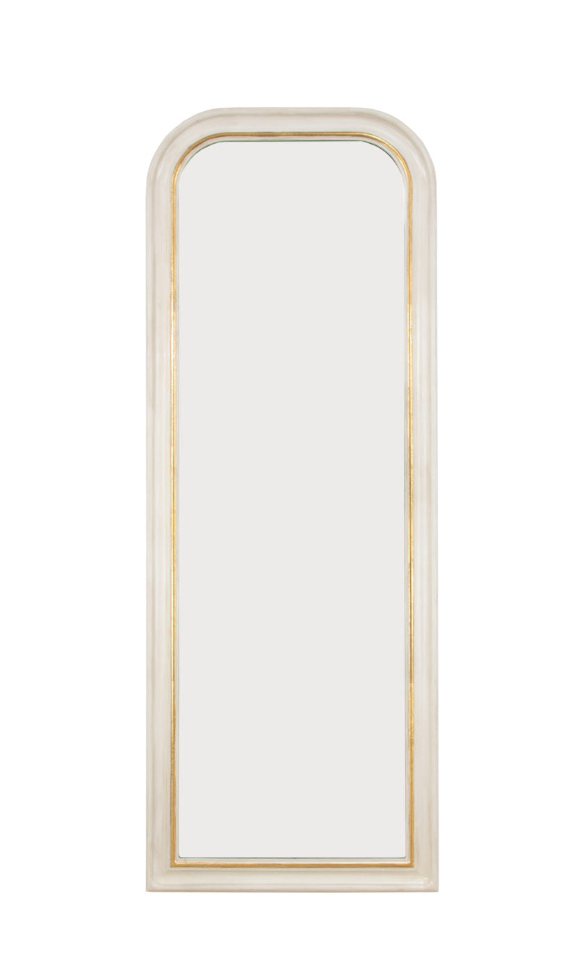 Classic Louis Philippe style full length mirror. Handmade antique white leaf mirror with gold leaf accent on inside edge of the wooden frame. A tall mirror is perfect for full body viewing, it can be hung as a large wall mirror or leaned against a wall to see your entire reflection. It can also be used as a way to bring light and space into a room. Adding an oversized mirror can make your space appear larger and more inviting, especially if placed in a foyer or living room or bedroom.