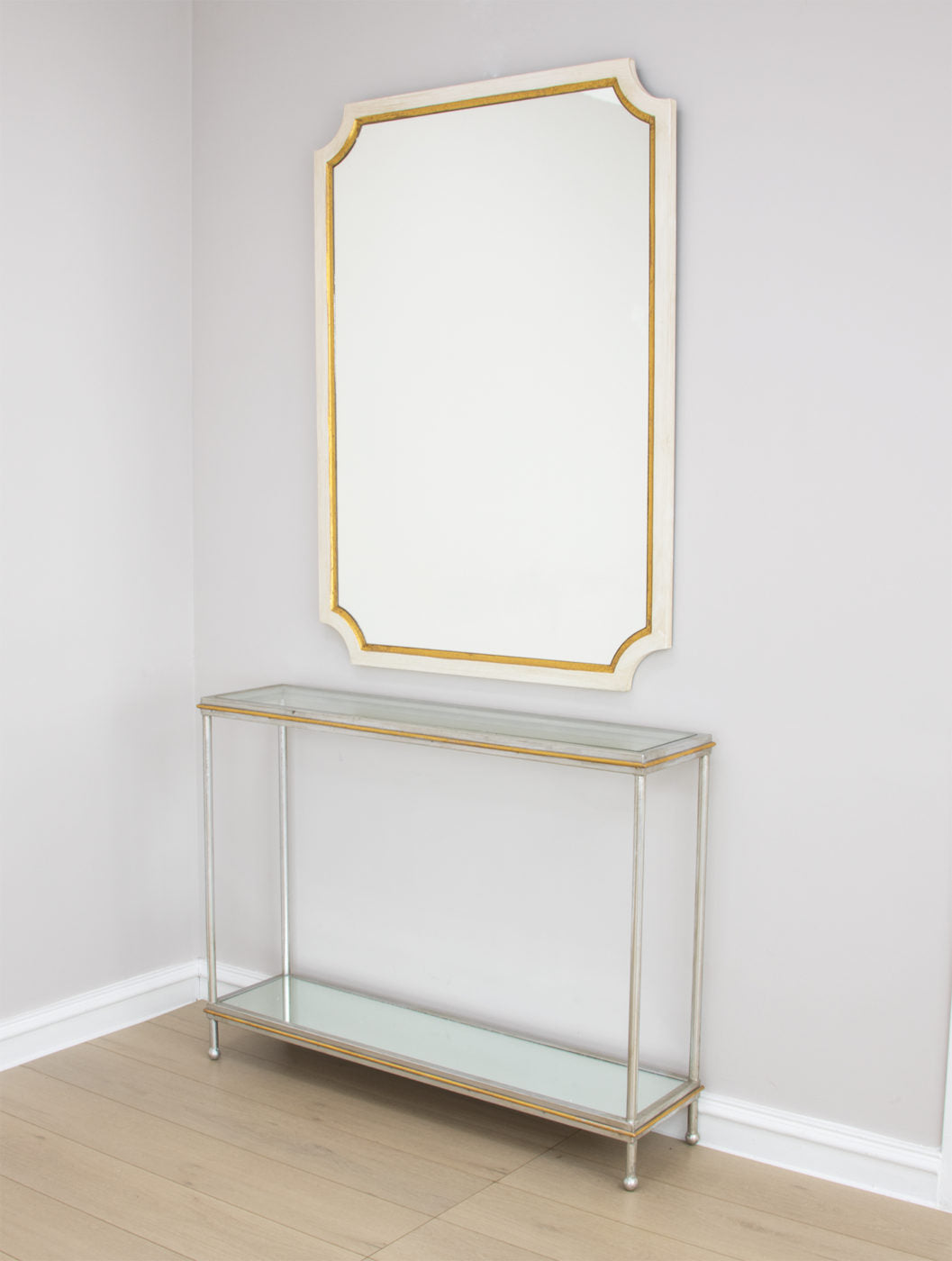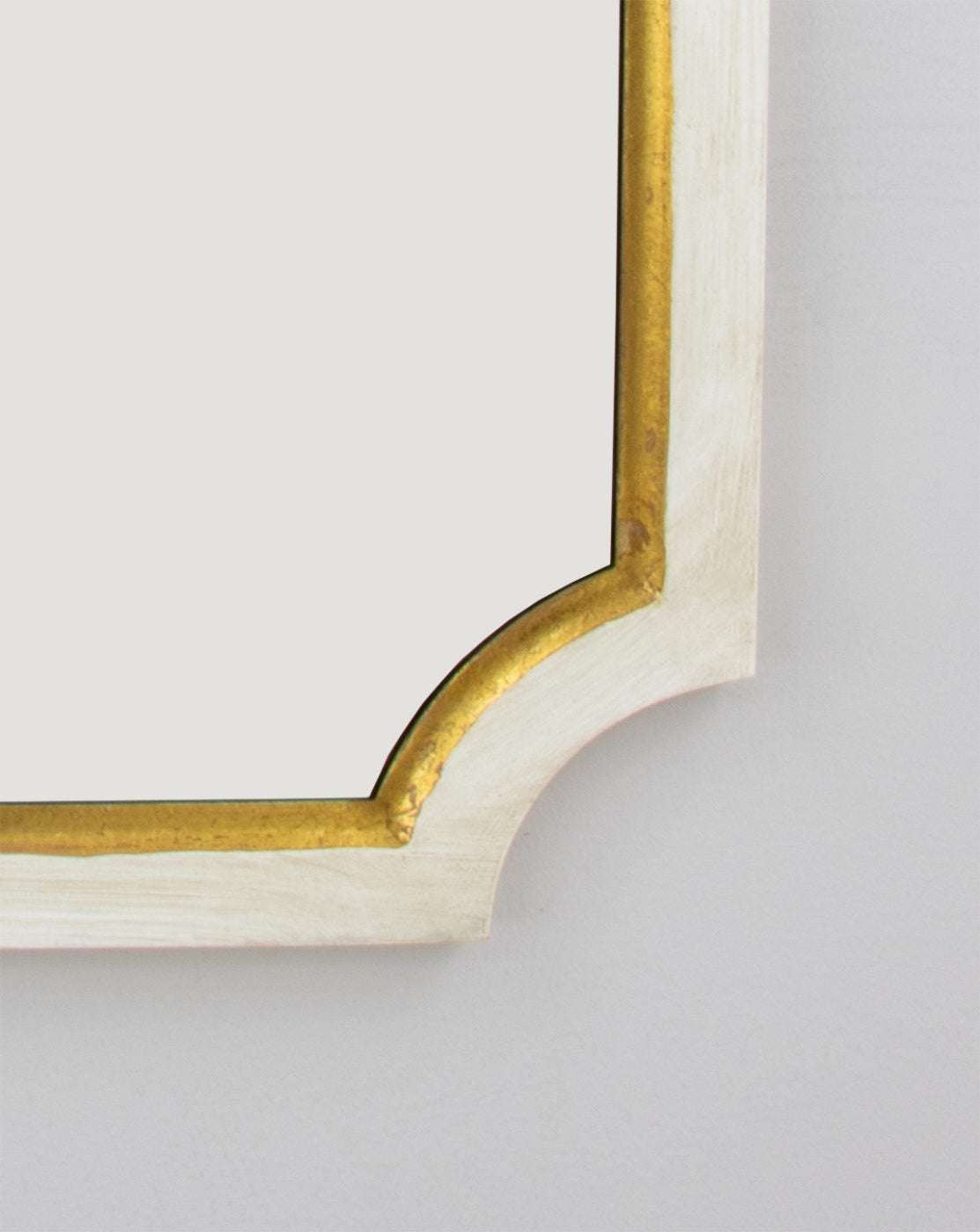 This mirror exudes charm and elegance with reverse-scalloped corners. Classic and timeless, accessorize your living space and with the magnificent styling of this beautiful mirror. Perfectly finished antiqued white and gold color gives a unique look and charm.