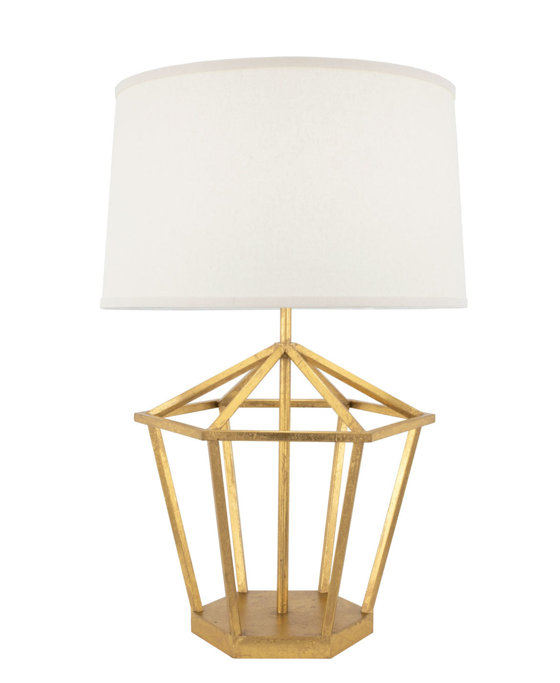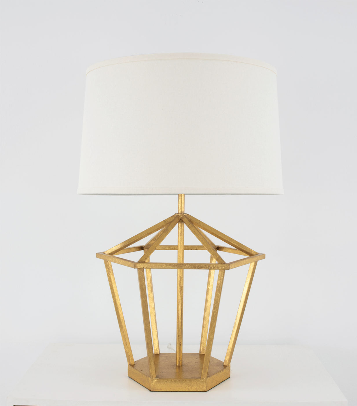 It’s a statement maker on a hexagonal base and topped with a white linen drum shade. Sophisticated and striking, the style extends all the way to the plug with clear finish cord.