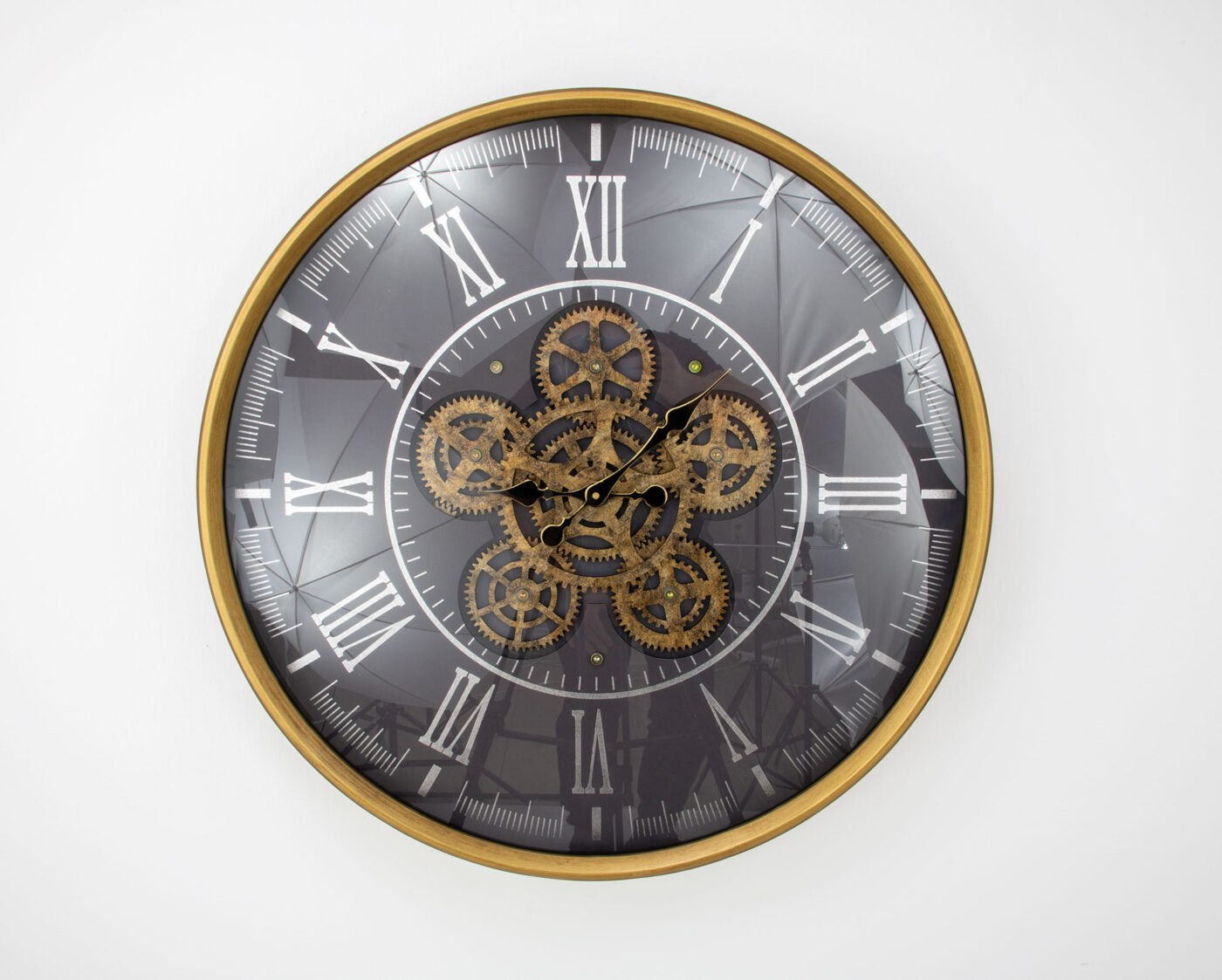 - color: Antiqued Gold Frame with silver Roman numerals, Antiqued Bronze Mechanism with dark grey background