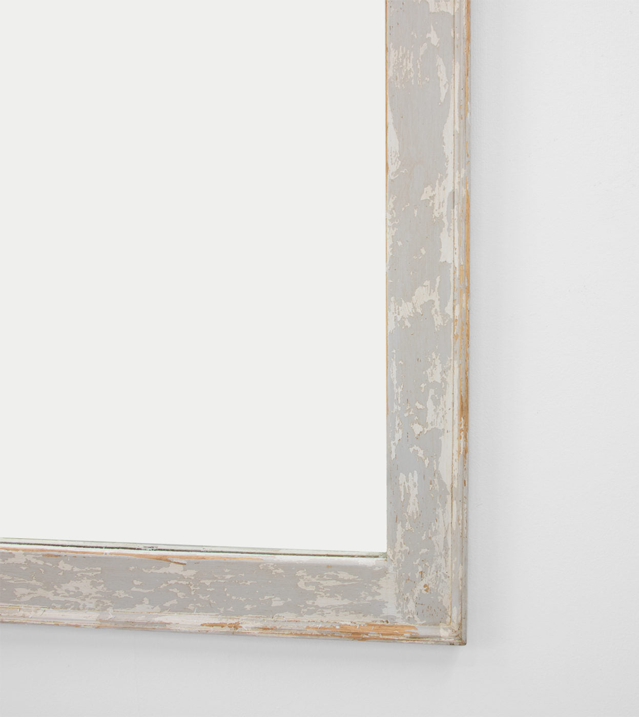 Handmade and hand painted reclaimed wood frame mirror. Has a distressed French grey color with off white distressing.