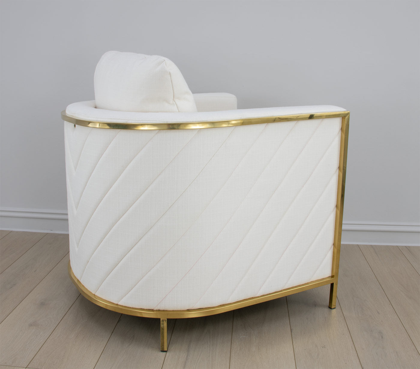 Sienna gold and white chair adds a rich luxury and glam deco style to your interior design work with the barrel back and off white fabric this piece is an amazing addition to the any living room, office, bedroom, or entryway. This armchair sits on a gold stainless steel sled base and is completed with linen fabric.