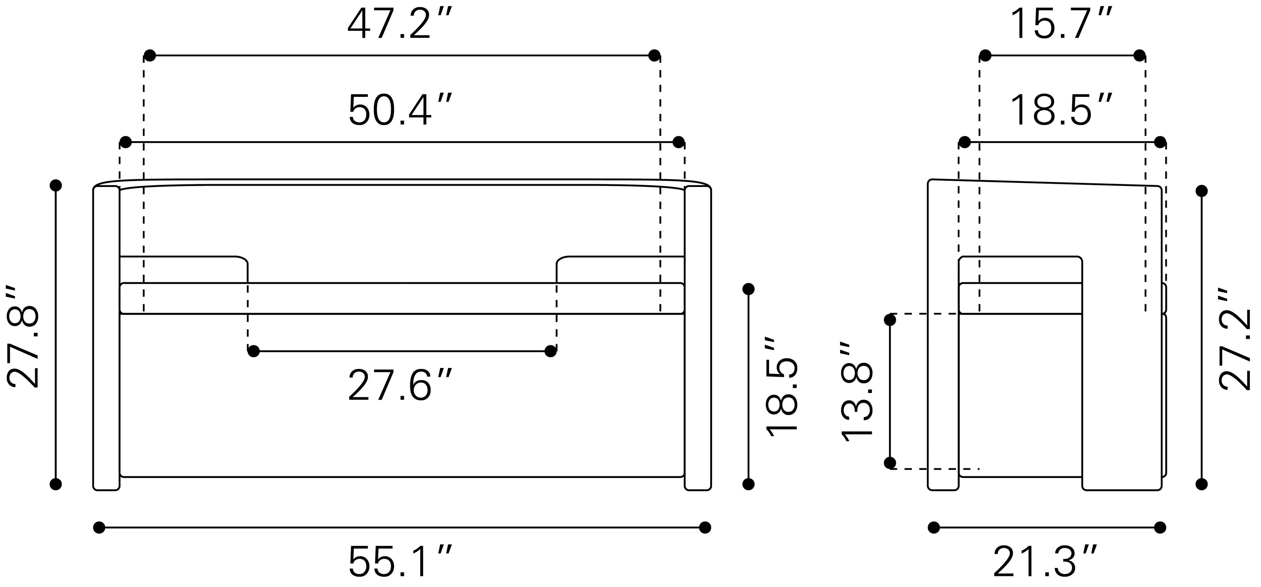 - 49.6" SW x 18.1" SD x 18.5" SH, 27.6" AH
