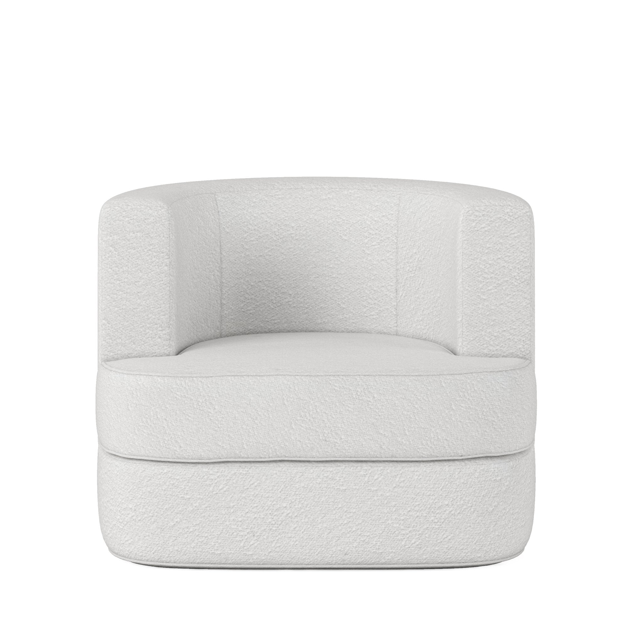 - Barrel style swivel chair features a tight back and loose seat cushion