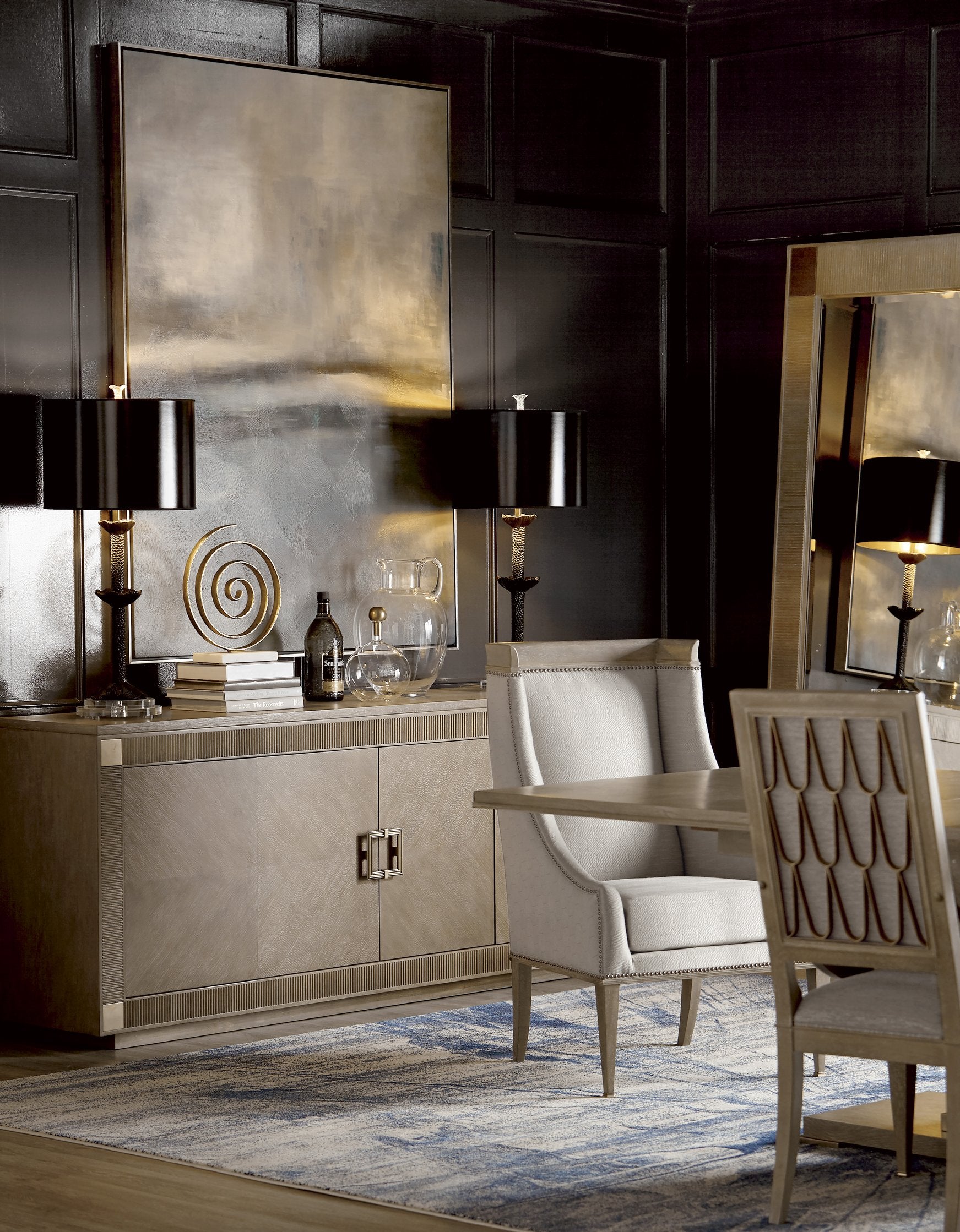 With a mix of clean-lined modern design and traditional silhouettes, the Cityscapes collection brings home the serene spirit of a luxurious spa vacation. The comprehensive 45-piece collection is rich with subtle details, from the swag motif on the back of a dining chair, to the channel tufting on an upholstered headboard, to the travertine top of a slim-legged nightstand--each design and detail executed with artisanal care. Throughout the collection the gold and warm gray palette is accented with brass, stone, glass and wood and enhanced with jewelry-like gold-toned hardware, custom designed and custom made.