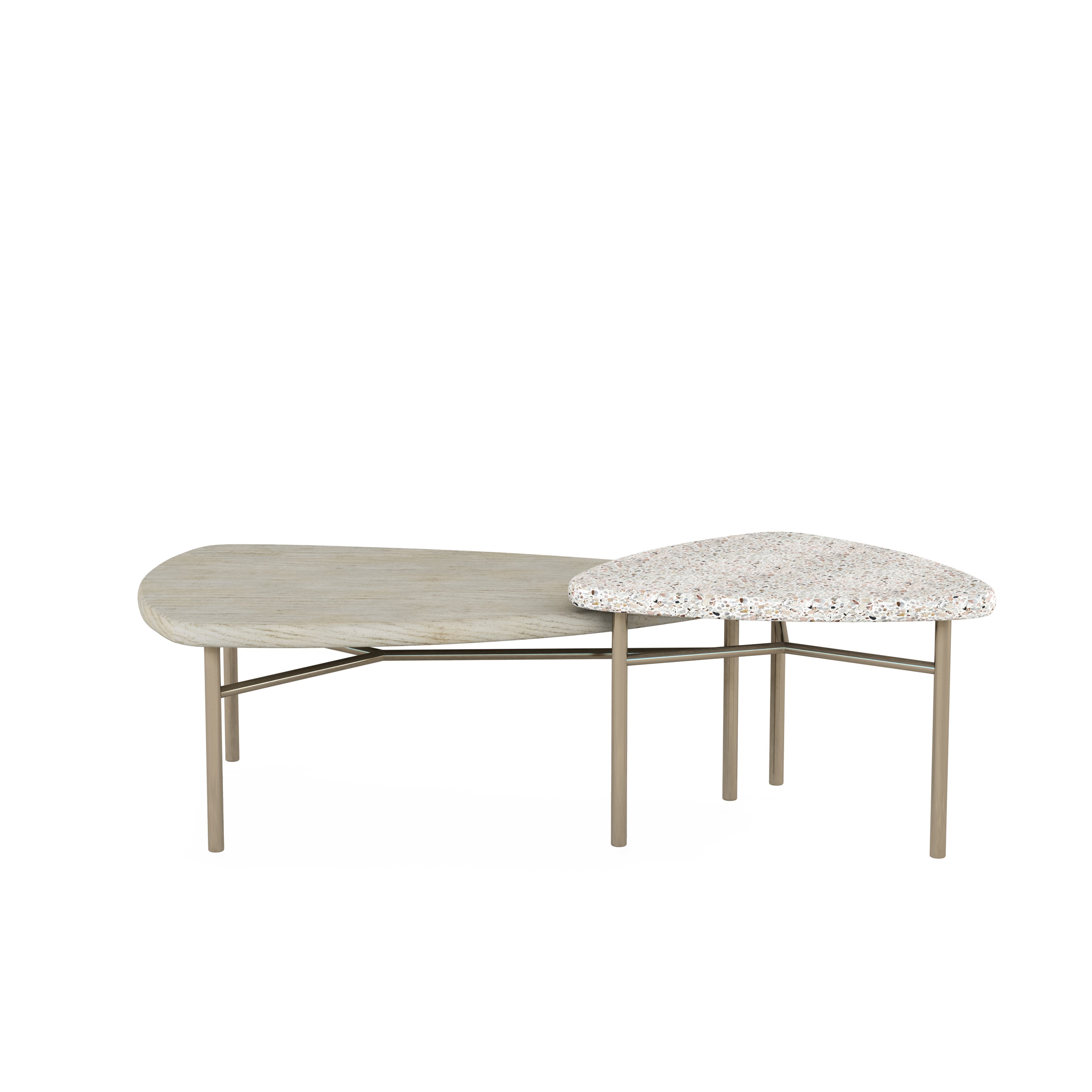 - Two piece set includes one (1) wood top table and one (1) Terrazzo top table