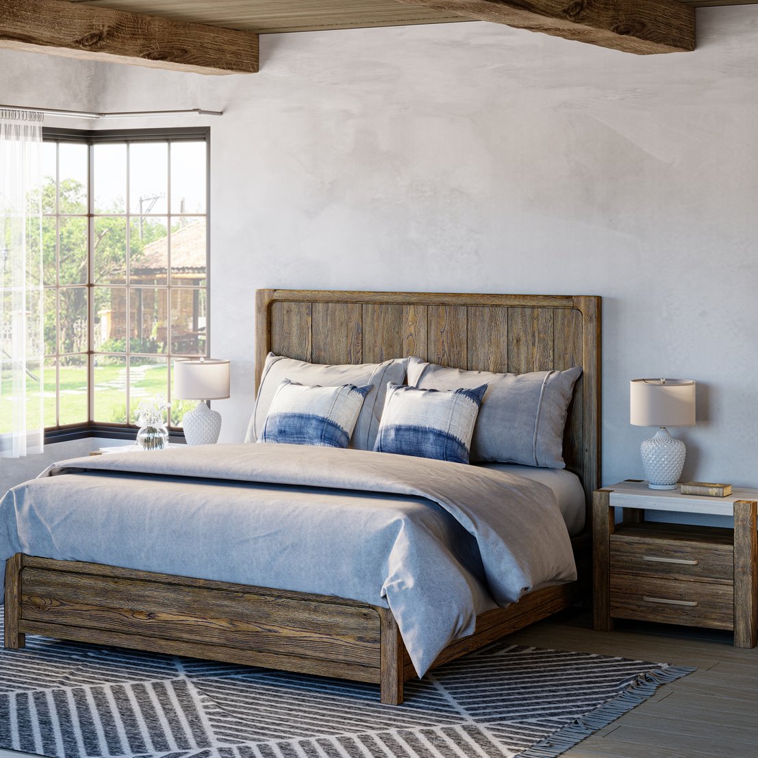 Bring the drama with a collection defined by boldly simple forms that reflects the aesthetic of a global traveler. Hefty wood in an oiled oak style is angular and eye-catching, accented by subtly arched details reminiscent of doorways around the world that lead to mystery and intrigue. This look honors natural materials with a knotty, highly visible wood grain highlighted by subtle metallic finishes and finely tailored upholstery, for a look that’s equal parts eclectic and chic.