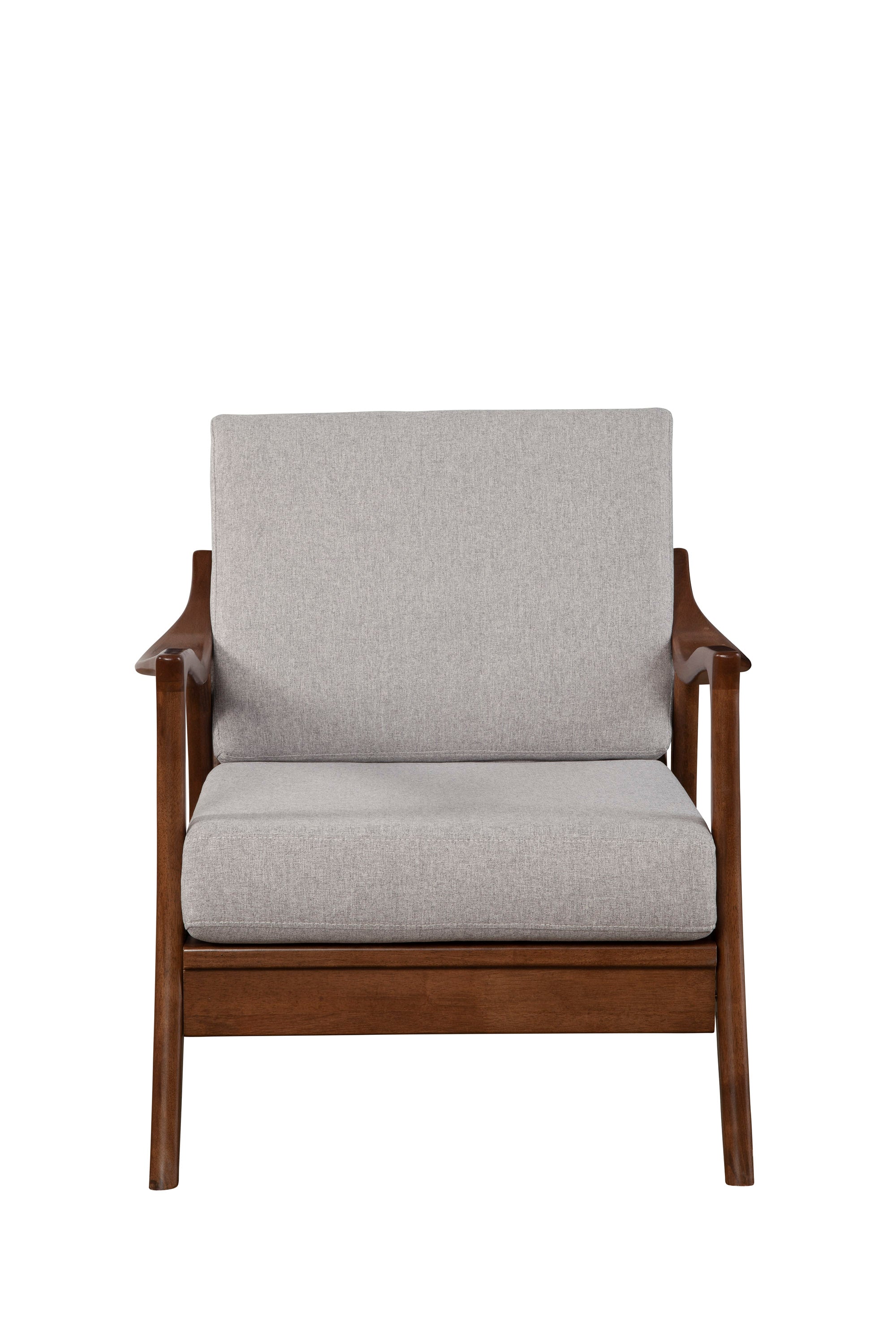 - COLOR: Medium Brown Frame, Light Grey Cushions