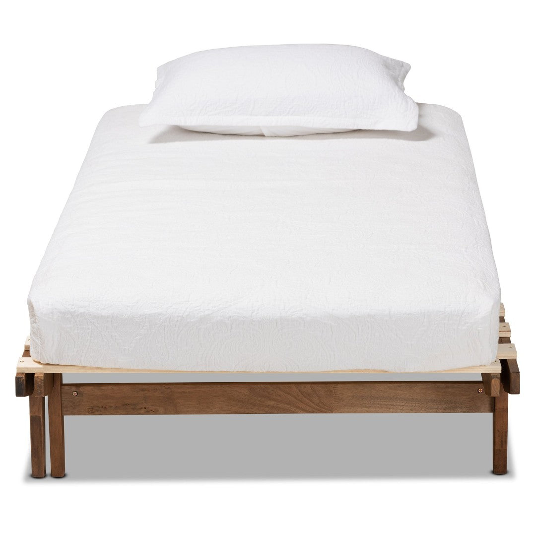 Keep your bedroom effortlessly stylish and highly adaptable with the Hiro bed frame. Crafted with a warm walnut finish and clean modern lines, this expandable platform bed pairs contemporary design—inclined headboard panels and tapered legs—with practical functionality: it converts from a twin to a king size quickly, supports a mattress without a box spring, and is built to last with solid wood construction.