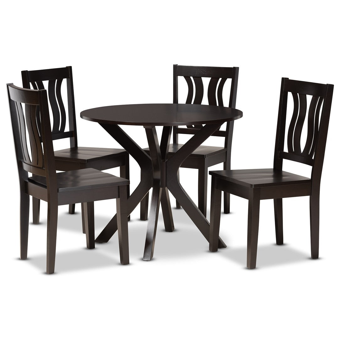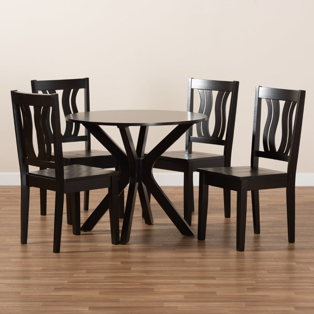 Add a touch of modern-transitional elegance to your dining area with the Mare 5-piece dining set. Crafted in Malaysia with a rich dark brown finish, this set blends refined geometric detailing and comfortable sculpted seating to create a stylish yet approachable focal point for everyday meals and intimate gatherings. Its circular tabletop and thoughtfully proportioned chairs maximize conversation and comfort in smaller dining spaces while delivering durable construction from quality hardwoods.