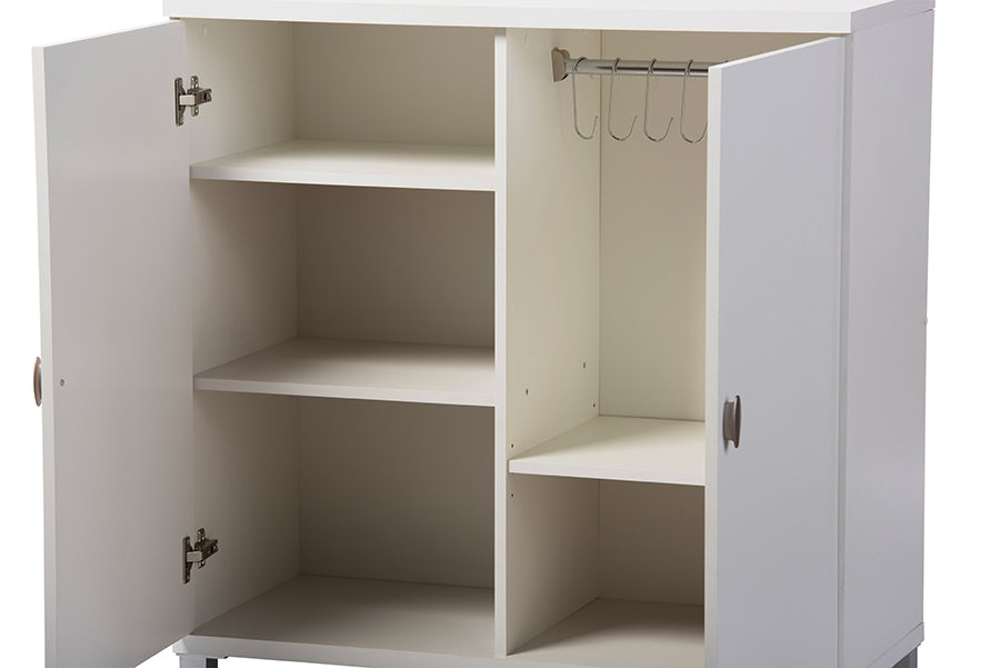 - Two doors with stainless steel handles reveal 5 storage shelves in different sizes to suit the needs for different sizes of bags