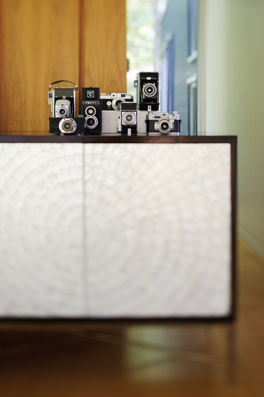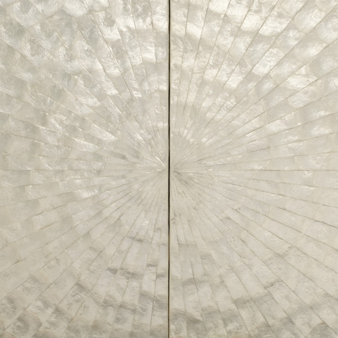 - Two pairs of doors with inlaid Capiz shell door fronts and touch latch. Behind left doors is one adjustable/removable shelf and one hole with grommet in back panel. Behind right doors are three drawers.
